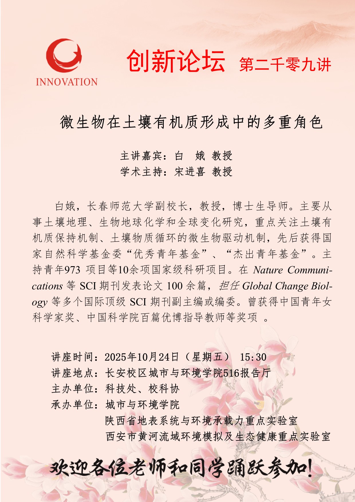 白娥 教授 8868体育登录创新论坛第二千零九讲:微生物在土壤有机质形成中的多重角色 讲座时间 2025年10月24日(星期五) 15:30 讲座地点 长安校区城市与环境学院516报告厅 讲座人介绍 白娥 教授 讲座内容