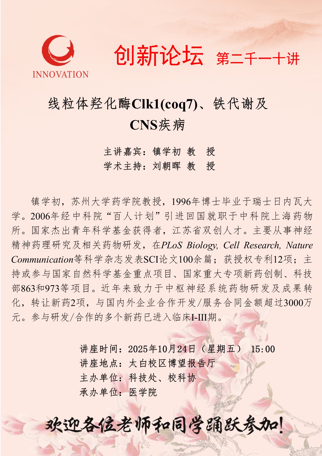 镇学初 教授 8868体育登录创新论坛第二千一十讲:线粒体羟化酶Clk1(coq7)、铁代谢及CNS疾病 讲座时间 2025年10月24日(星期五) 15:00 讲座地点 太白校区博望报告厅 讲座人介绍 镇学初 教授 讲座内容