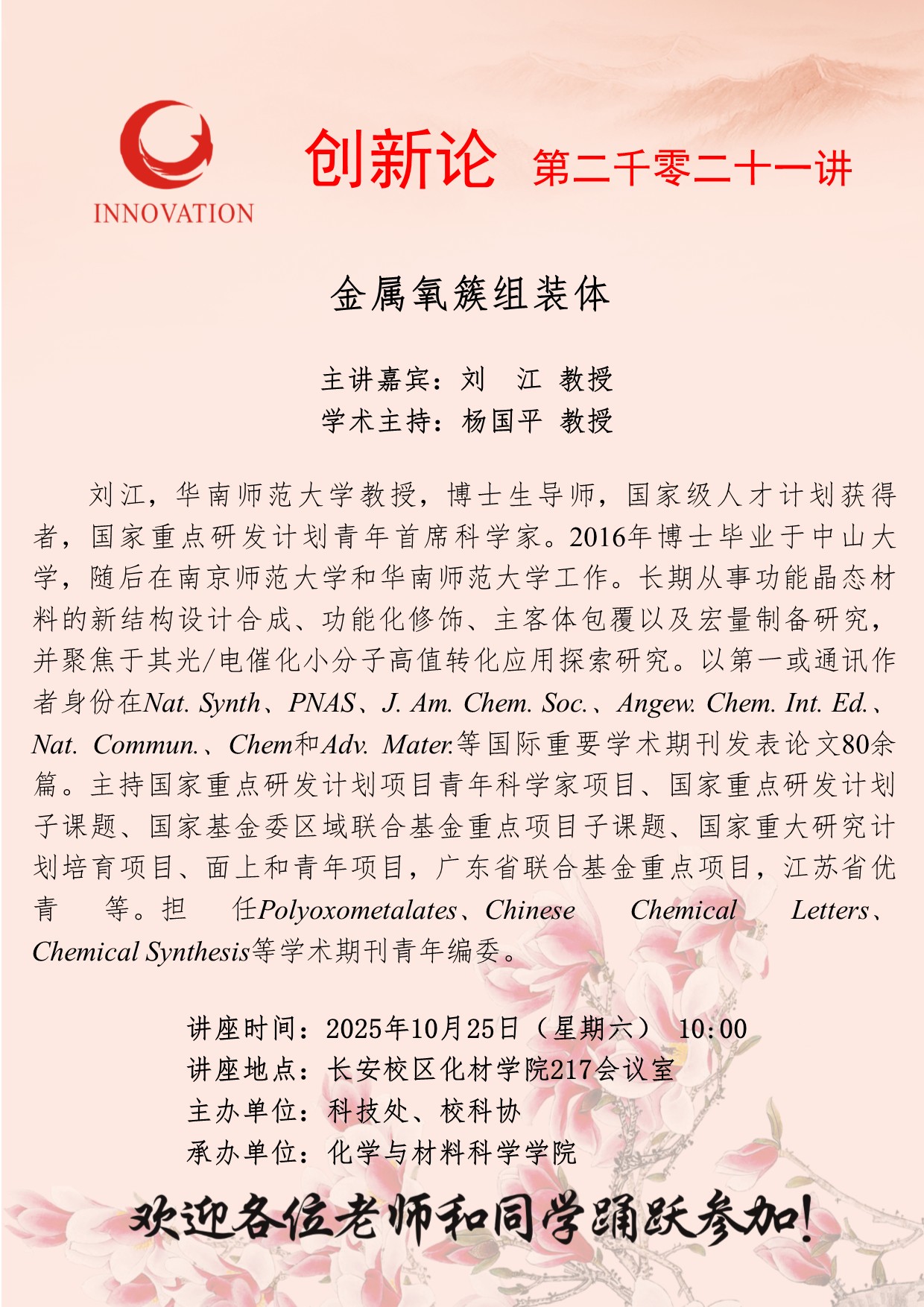 刘 江 教授 8868体育登录创新论坛第二千零二十一讲:金属氧簇组装体 讲座时间 2025年10月25日(星期六) 10:00 讲座地点 长安校区化材学院217会议室 讲座人介绍 刘 江 教授 讲座内容