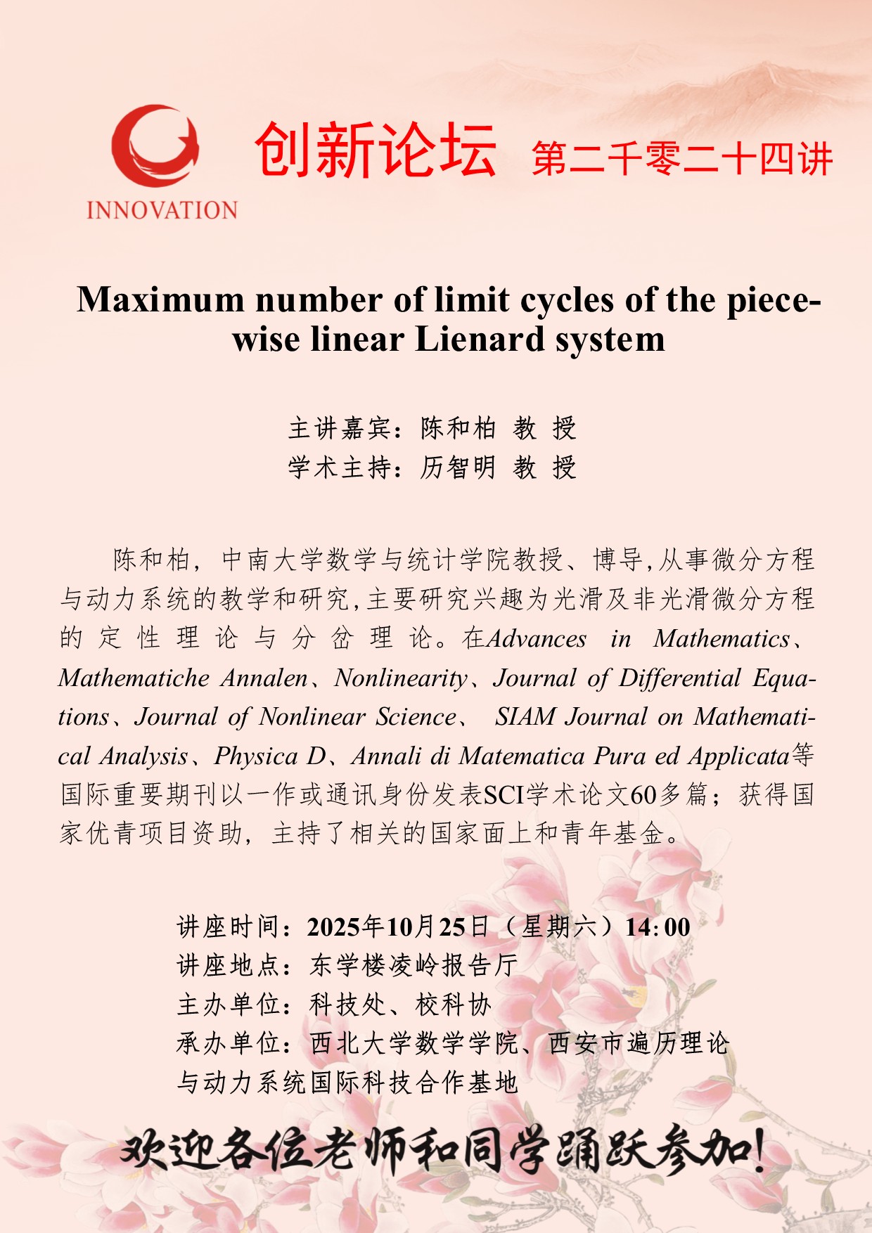 陈和柏 教 授 8868体育登录创新论坛第二千零二十四讲:Maximum number of limit cycles of the piecewise linear Lienard system 讲座时间 2025年10月25日(星期六)14:00 讲座地点 东学楼凌岭报告厅 讲座人介绍 陈和柏 教 授 讲座内容