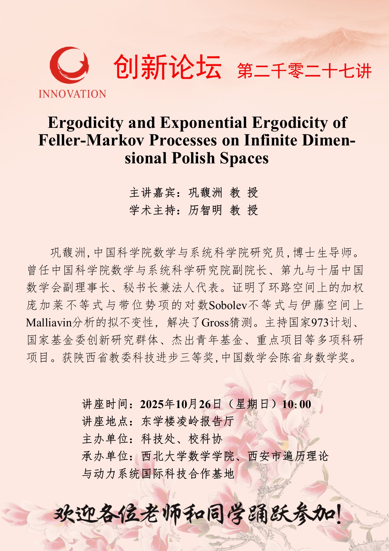 巩馥洲 教 授 8868体育登录创新论坛第二千零二十七讲:Ergodicity and Exponential Ergodicity of Feller-Markov Processes on Infinite Dimensional Polish Spaces 讲座时间 2025年10月26日(星期日)10:00 讲座地点 东学楼凌岭报告厅 讲座人介绍 巩馥洲 教 授 讲座内容