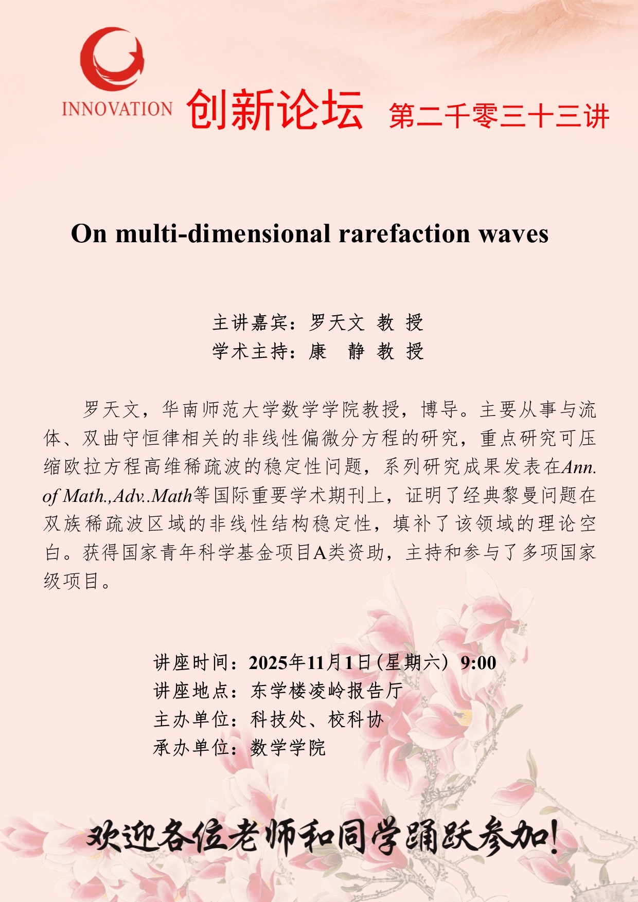 罗天文 教 授 8868体育登录创新论坛第二千零三十三讲:On multi-dimensional rarefaction waves 讲座时间 2025年11月1日(星期六) 9:00 讲座地点 东学楼凌岭报告厅 讲座人介绍 罗天文 教 授 讲座内容