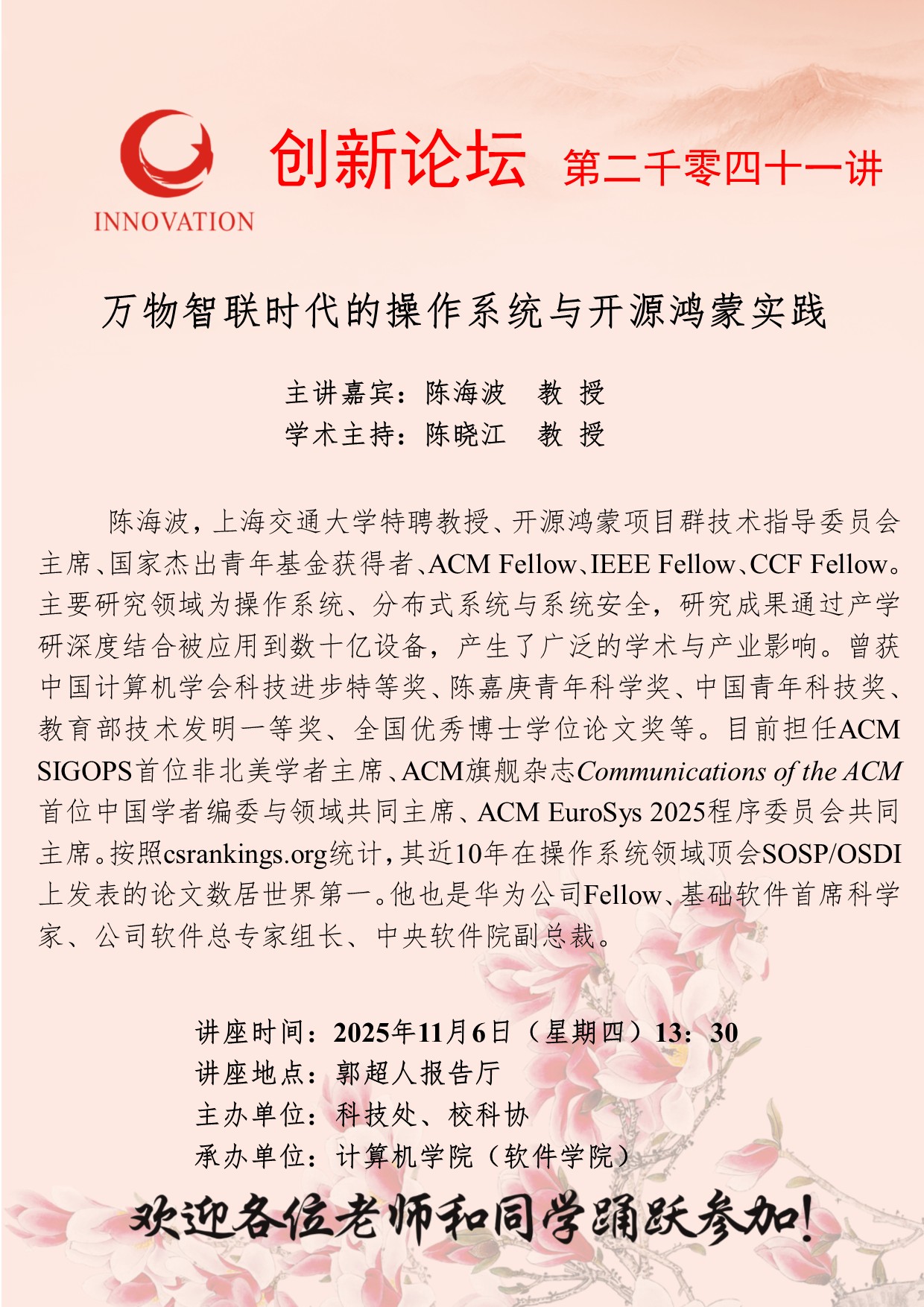 陈海波 教授 8868体育登录创新论坛第二千零四十一讲:万物智联时代的操作系统与开源鸿蒙实践 讲座时间 2025年11月6日(星期四)13:30 讲座地点 郭超人报告厅 讲座人介绍 陈海波 教授 讲座内容