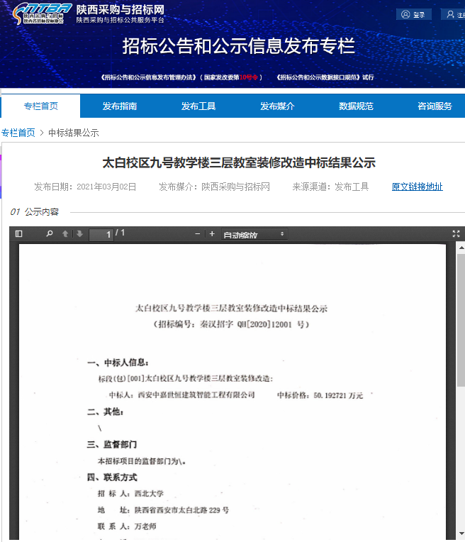 太白校区九号教学楼三层教室装修改造中标结果公示