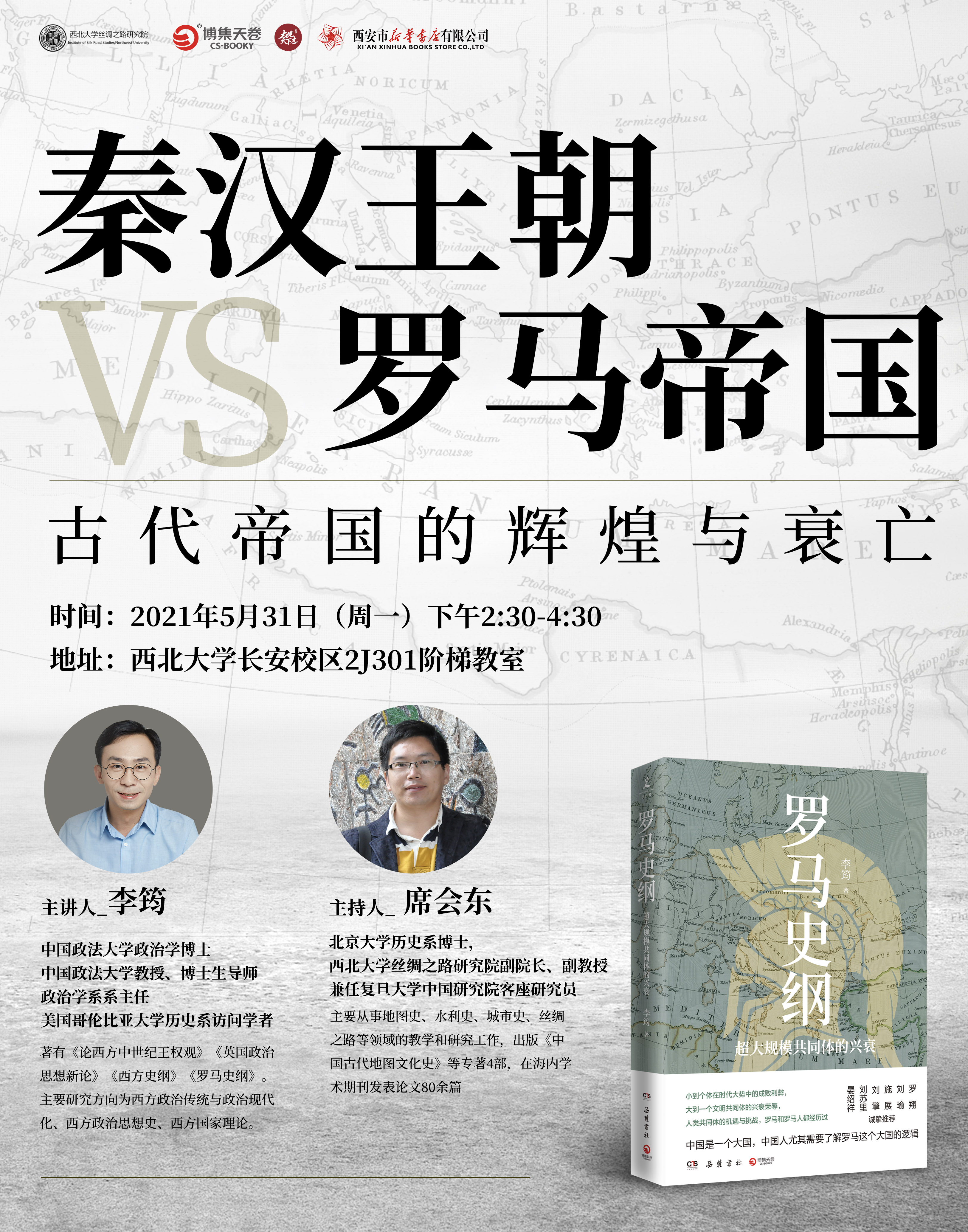 讲座预告:秦汉王朝VS罗马帝国:古代帝国的辉煌与衰亡 作者: 编辑:叶苗 时间:2021-05-30 时间:2021年5月31号(周一)下午2:30-4:30 地点:8868体育登录长安校区2J301 主讲人:李筠 中国政法大学教授 主持人:席会东 8868体育登录丝绸之路研究院副教授