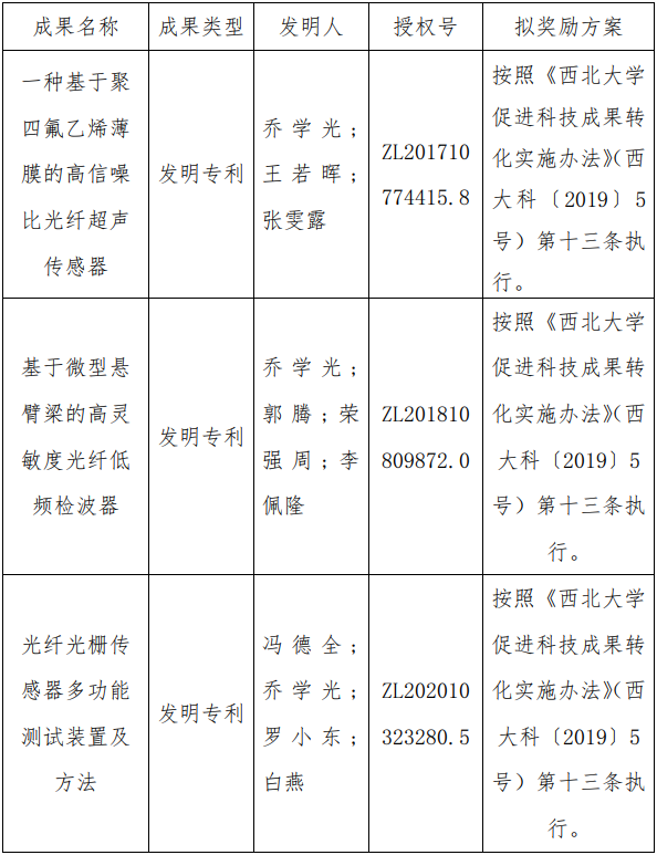 按照《8868体育登录促进科技成果转化实施办法》(西大科〔2019〕5号)相关规定,拟对8868体育登录物理学院乔学光教授作为成果负责人的3项发明专利权实施普通许可,现将相关信息公示如下: