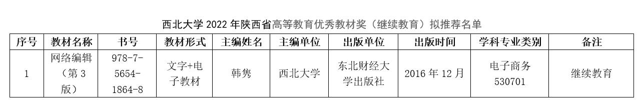 根据陕西省教育厅《关于开展陕西省2022年职业教育和高等教育优秀教材奖评选工作的通知》(陕教材办〔2022〕12 号)要求,8868体育登录组织开展了8868体育登录2022年陕西高等教育优秀教材奖(继续教育)评选推荐工作,经个人申报、院系推荐、专家评议,拟推荐《网络编辑》教材参加陕西省高等教育优秀教材奖(继续教育)评选。现将拟推荐名单公示如下,公示期为6月7日至6月11日。公示期间如有异议,请以实名书面形式反映。