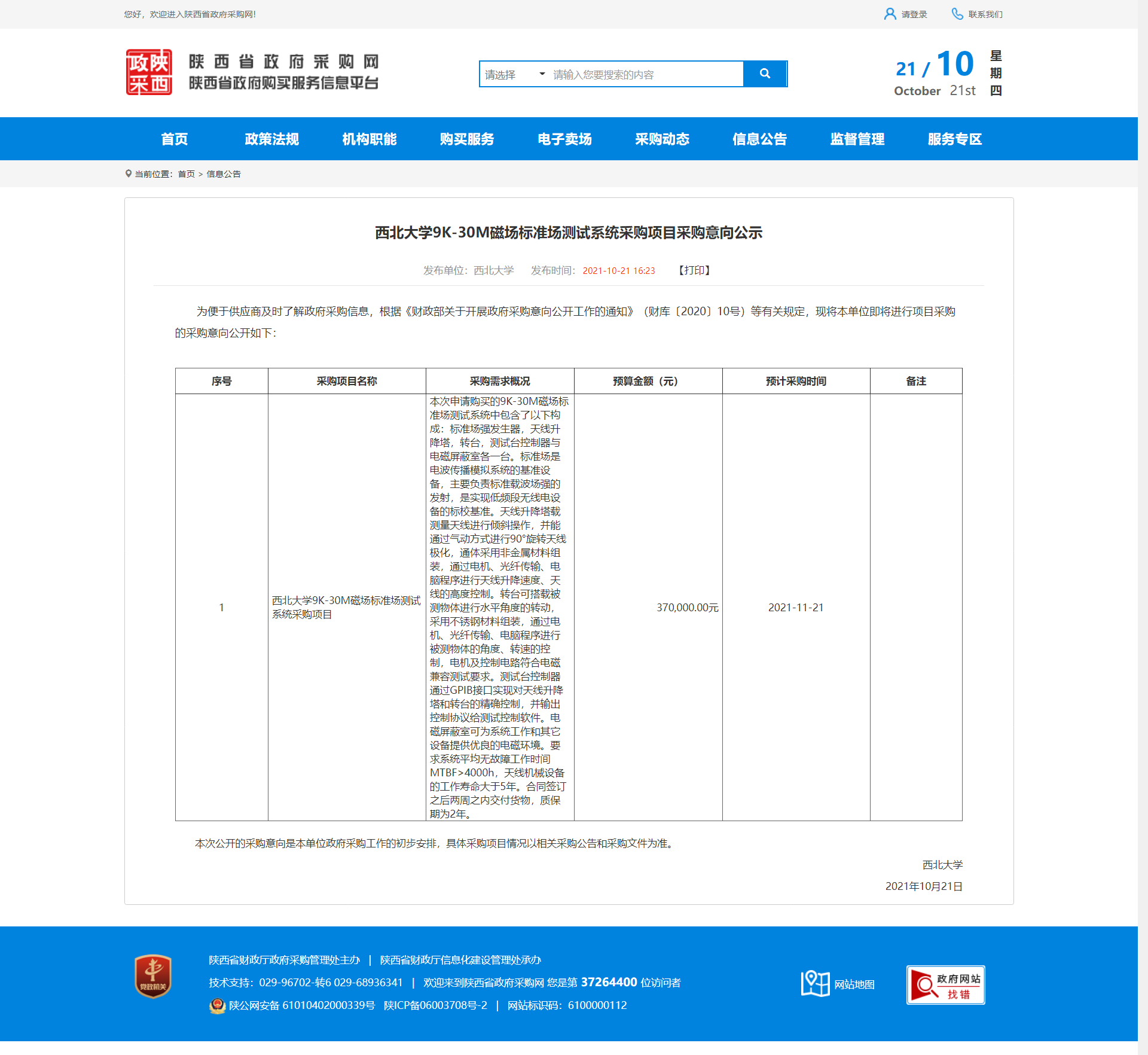 8868体育登录9K-30M磁场标准场测试系统采购项目采购意向公示 作者: 编辑:采购与招标办公室 时间:2021-10-21 原公告地址:http://ccgp-shaanxi.gov.cn/notice/noticeDetail.do?noticeguid=8a85be337c20d0b4017ca1bd9ec34088