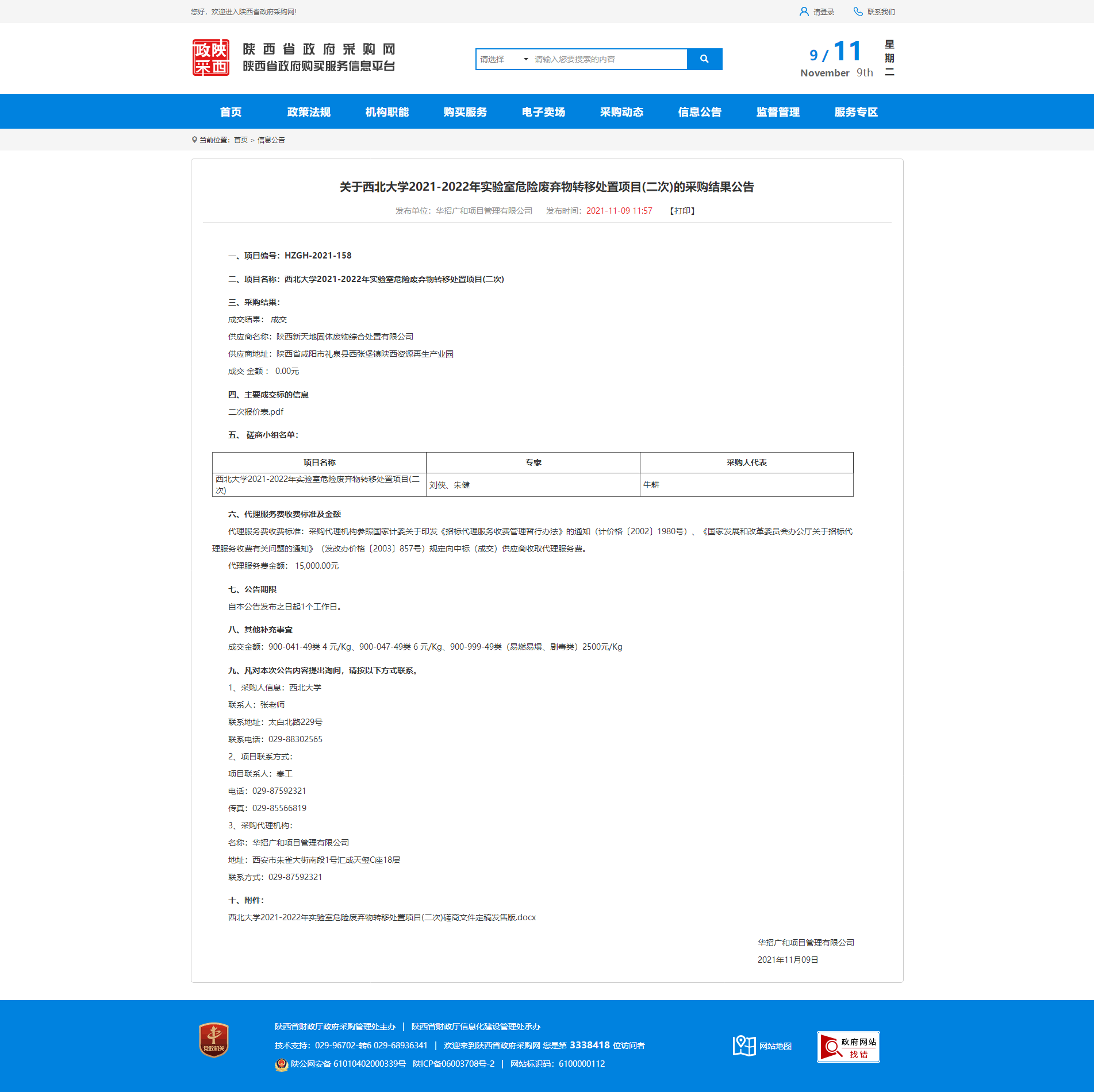 关于8868体育登录2021-2022年实验室危险废弃物转移处置项目(二次)的采购结果公告