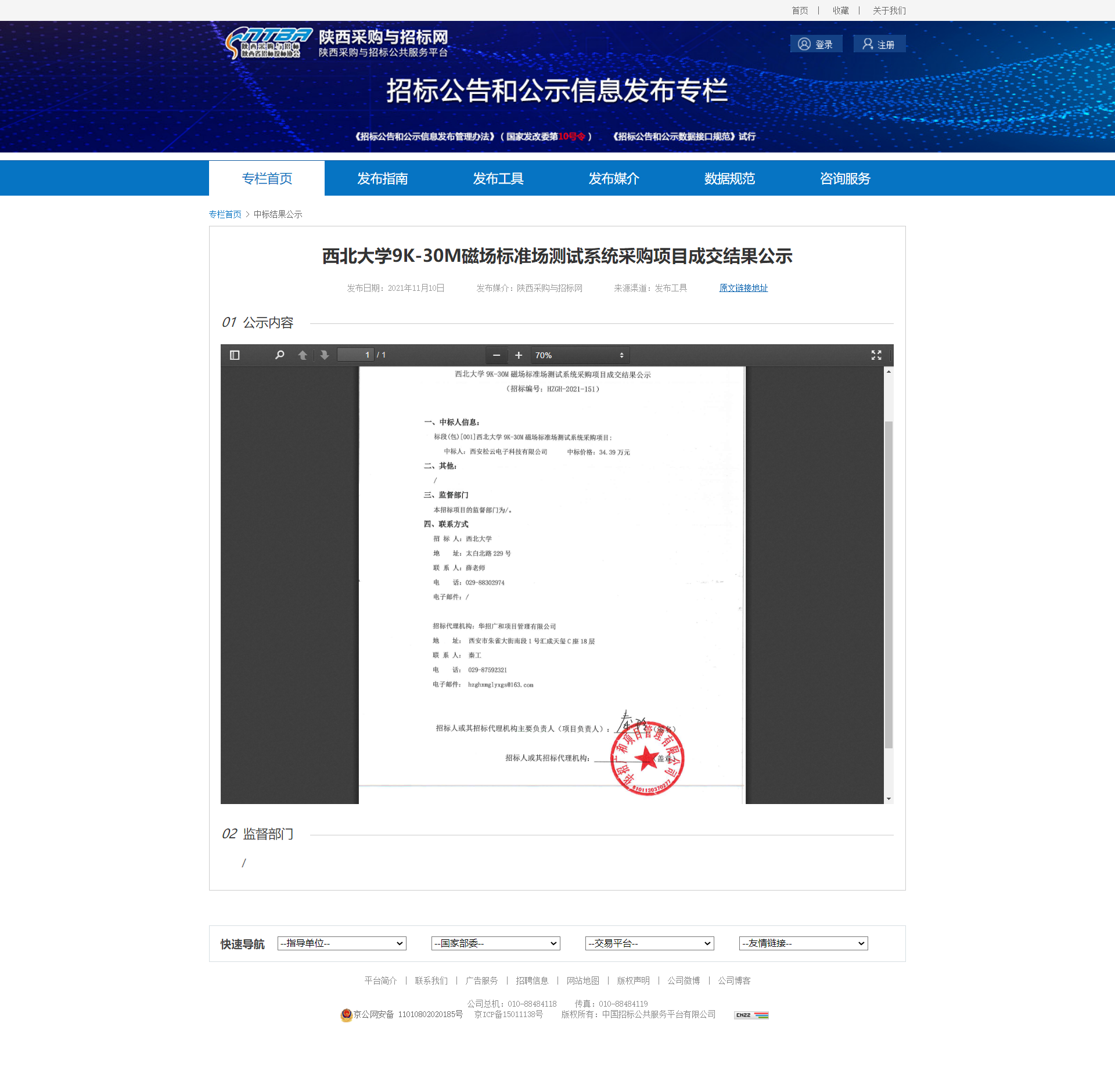 8868体育登录9K-30M磁场标准场测试系统采购项目成交结果公示 作者: 编辑:薛利娟 时间:2021-11-11 原公告网址:http://bulletin.sntba.com/resultBulletin/2021-11-10/362788.html