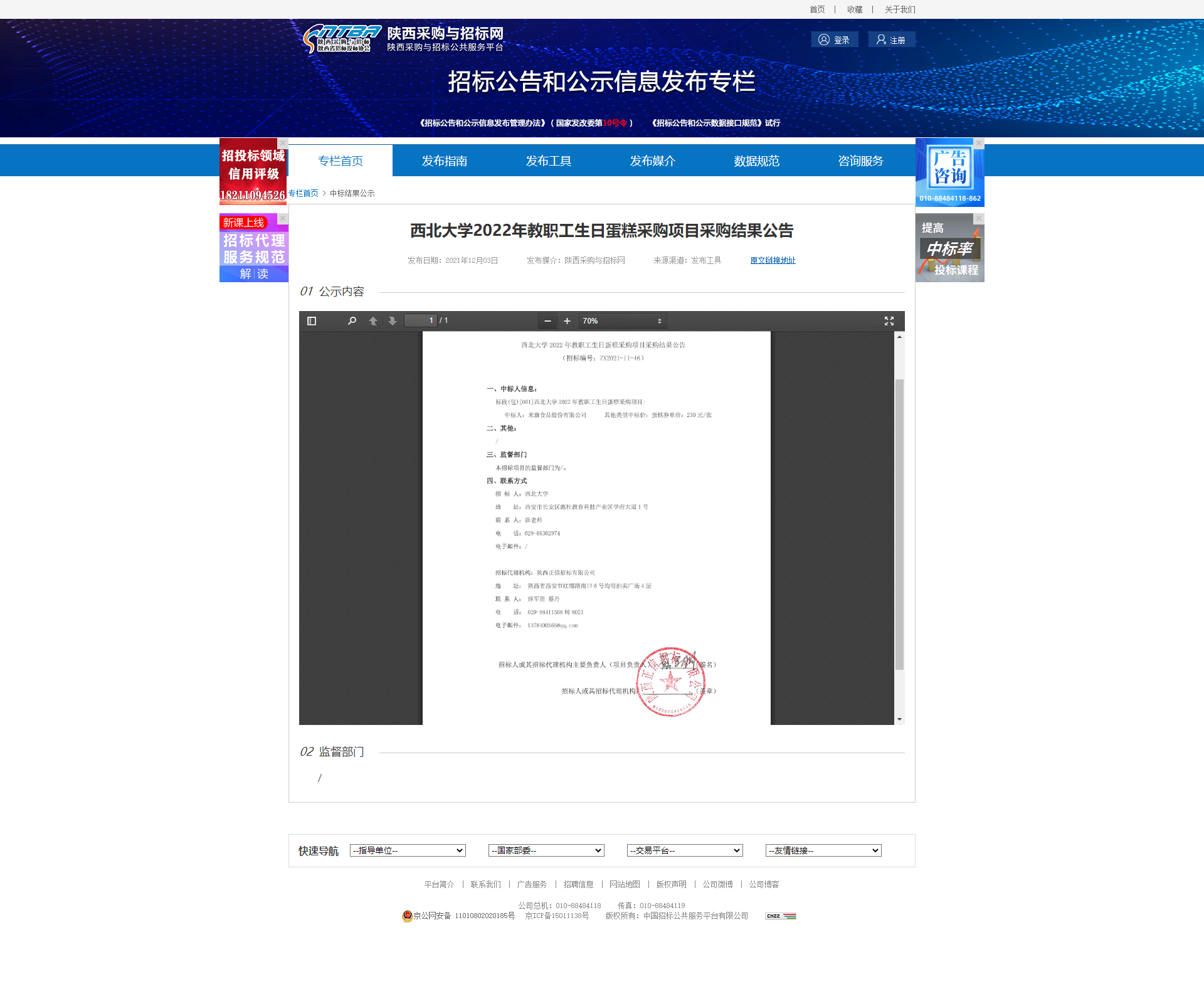 8868体育登录2022年教职工生日蛋糕采购项目采购结果公告 作者: 编辑:薛利娟 时间:2021-12-06 原公告网址:http://bulletin.sntba.com/resultBulletin/2021-12-03/371639.html