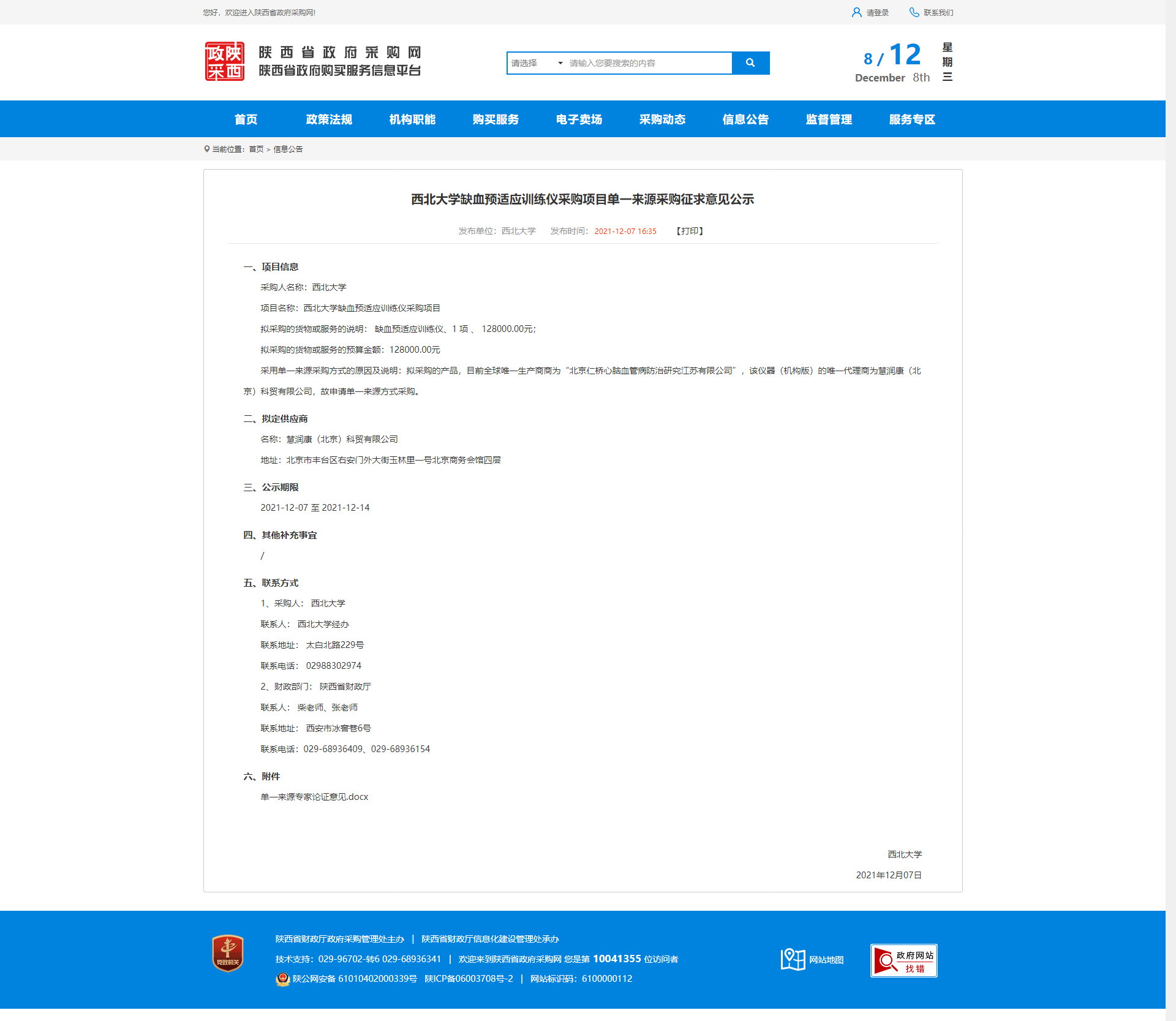 8868体育登录缺血预适应训练仪采购项目单一来源采购征求意见公示 作者: 编辑:薛利娟 时间:2021-12-08 原公告链接:http://www.ccgp-shaanxi.gov.cn/notice/noticeDetail.do?noticeguid=8a85be347d6a75c8017d9407fc0b61e6