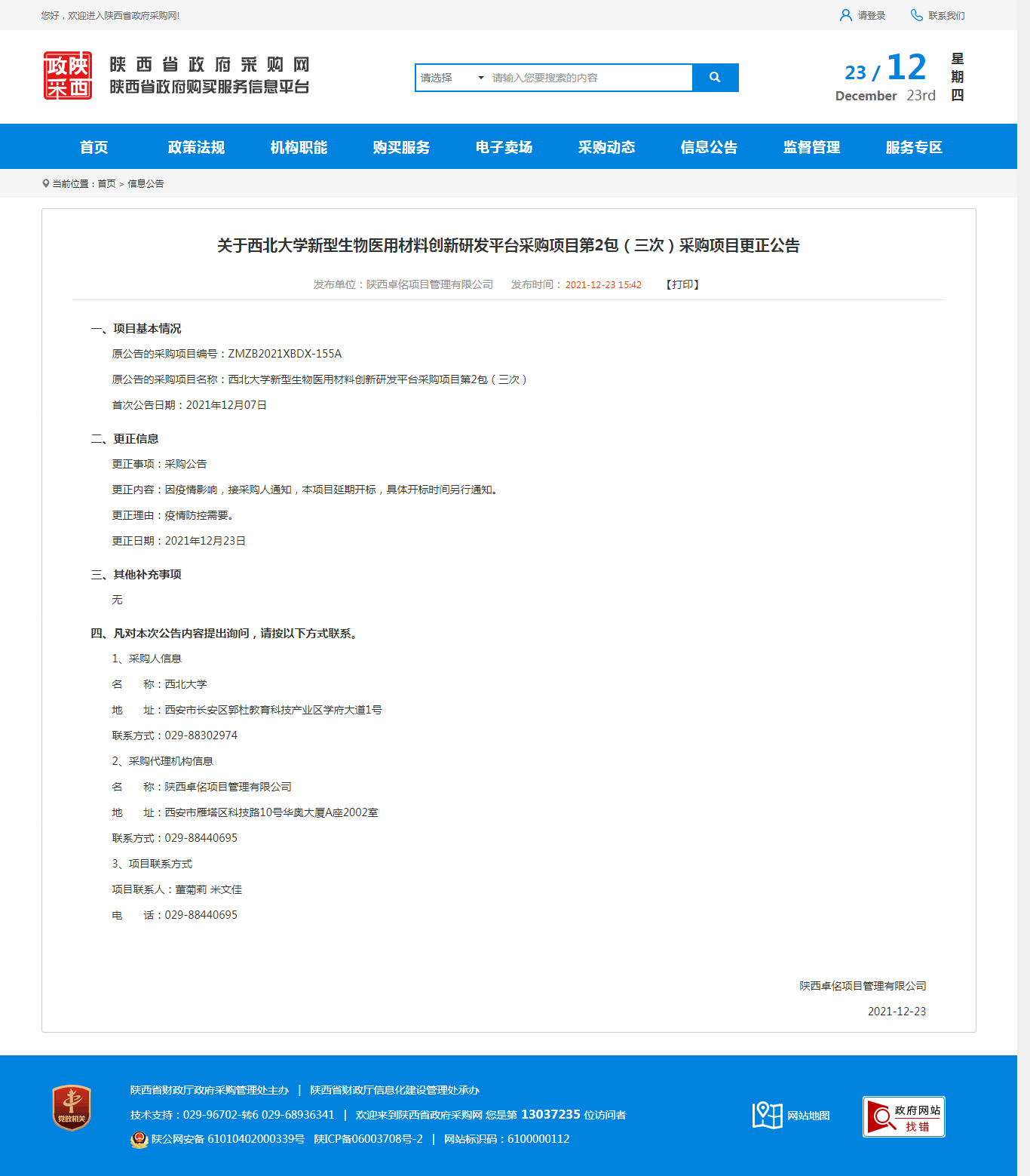 关于8868体育登录新型生物医用材料创新研发平台采购项目第2包(三次)采购项目更正公告 作者: 编辑:薛利娟 时间:2021-12-23 原公告链接:http://www.ccgp-shaanxi.gov.cn/notice/noticeDetail.do?noticeguid=8a85be327dace5d8017de63b467e2efd