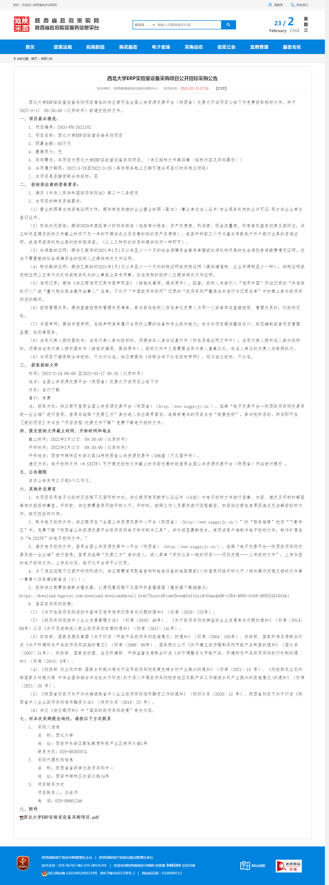 8868体育登录ERP实验室设备采购项目公开招标采购公告 作者: 编辑:薛利娟 时间:2022-02-23 原公告链接:http://www.ccgp-shaanxi.gov.cn/notice/noticeDetail.do?noticeguid=8a85be387e22c8ad017f25db42450373