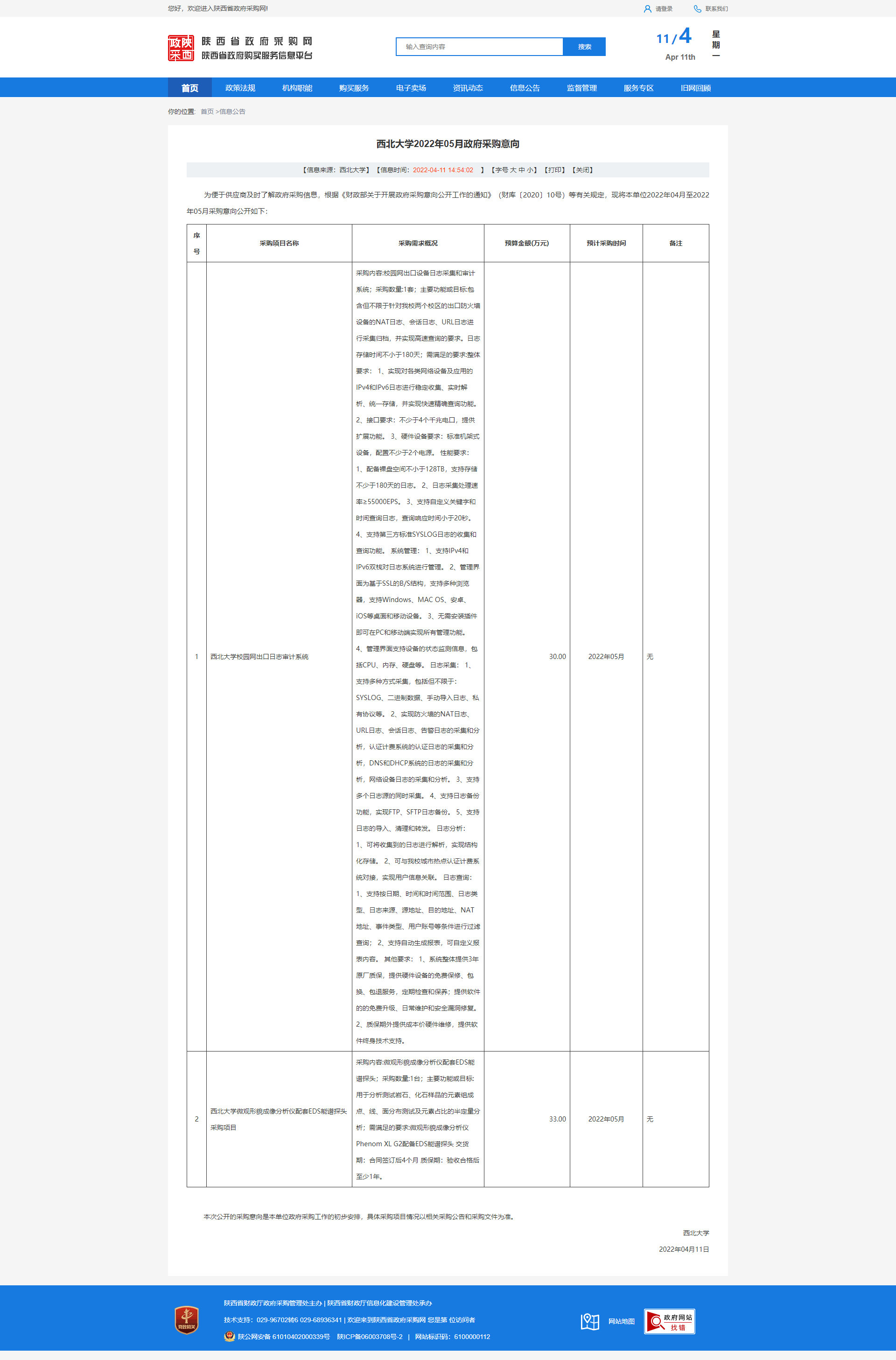 8868体育登录2022年05月政府采购意向 作者: 编辑:薛利娟 时间:2022-04-11 原公告链接:http://www.ccgp-shaanxi.gov.cn/freecms/site/shaanxi/ggxx/info/2022/8a69c92a80033b740180168305694239.html?noticeType=59¬iceId=4c032207-b964-11ec-9a8e-08c0eb20c666