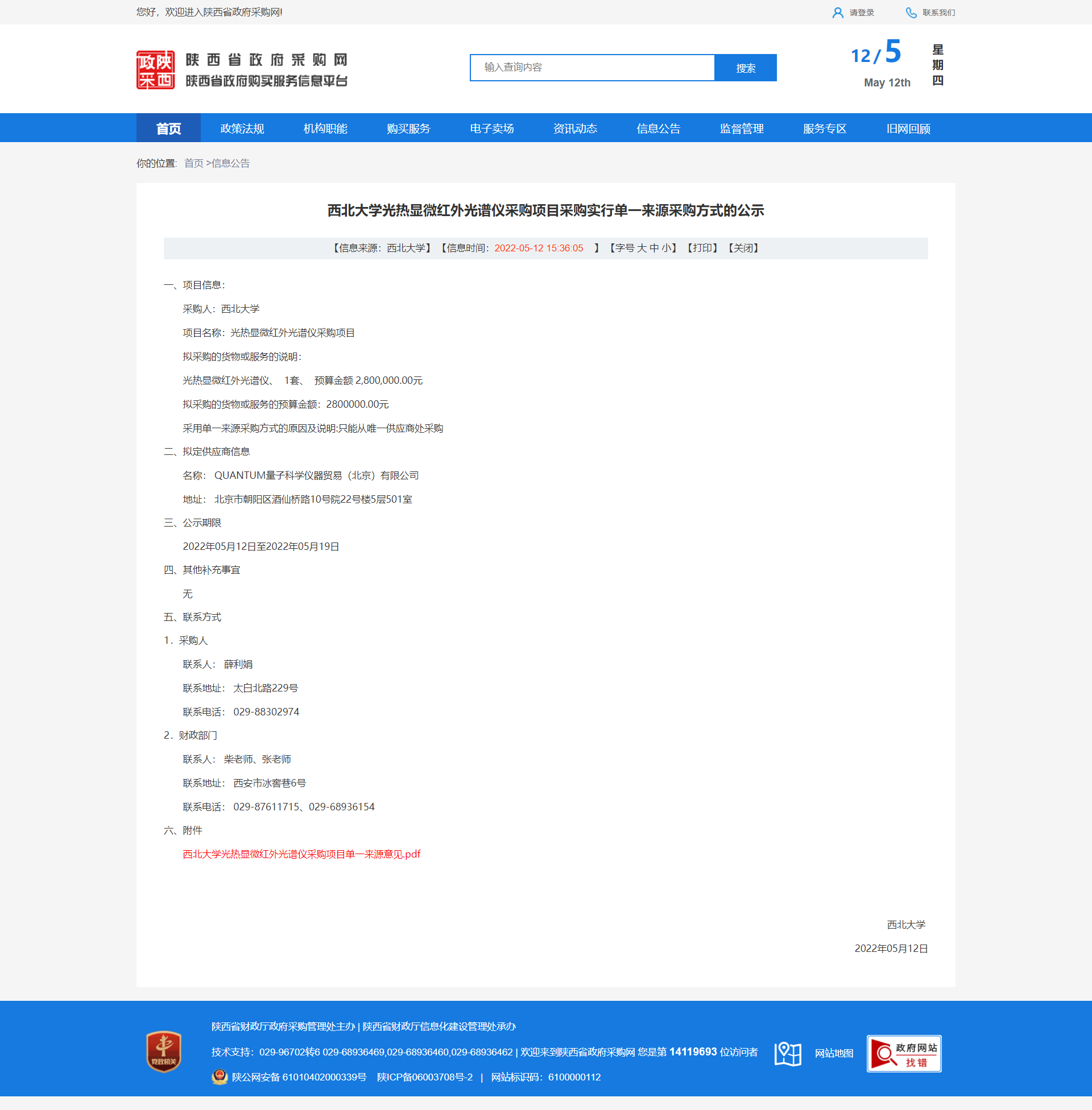 8868体育登录光热显微红外光谱仪采购项目采购实行单一来源采购方式的公示 作者: 编辑:薛利娟 时间:2022-05-12 原公告链接:http://www.ccgp-shaanxi.gov.cn/freecms/site/shaanxi/ggxx/info/2022/8a69c0c980b0a61b0180b723a9b03d17.html?noticeType=001051¬iceId=6429ac2f-d1c6-11ec-9a8e-08c0eb20c666