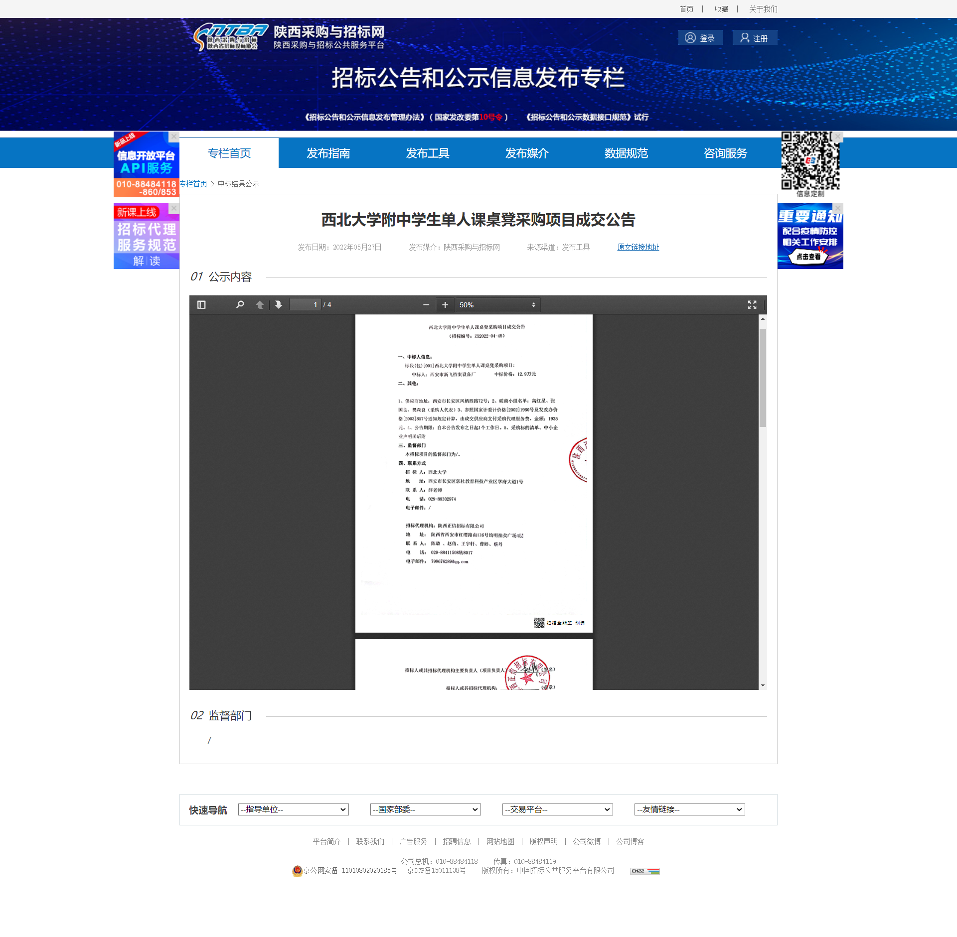 8868体育登录附中学生单人课桌凳采购项目成交公告 作者: 编辑:薛利娟 时间:2022-05-27 原公告链接:http://bulletin.sntba.com/resultBulletin/2022-05-27/426250.html
