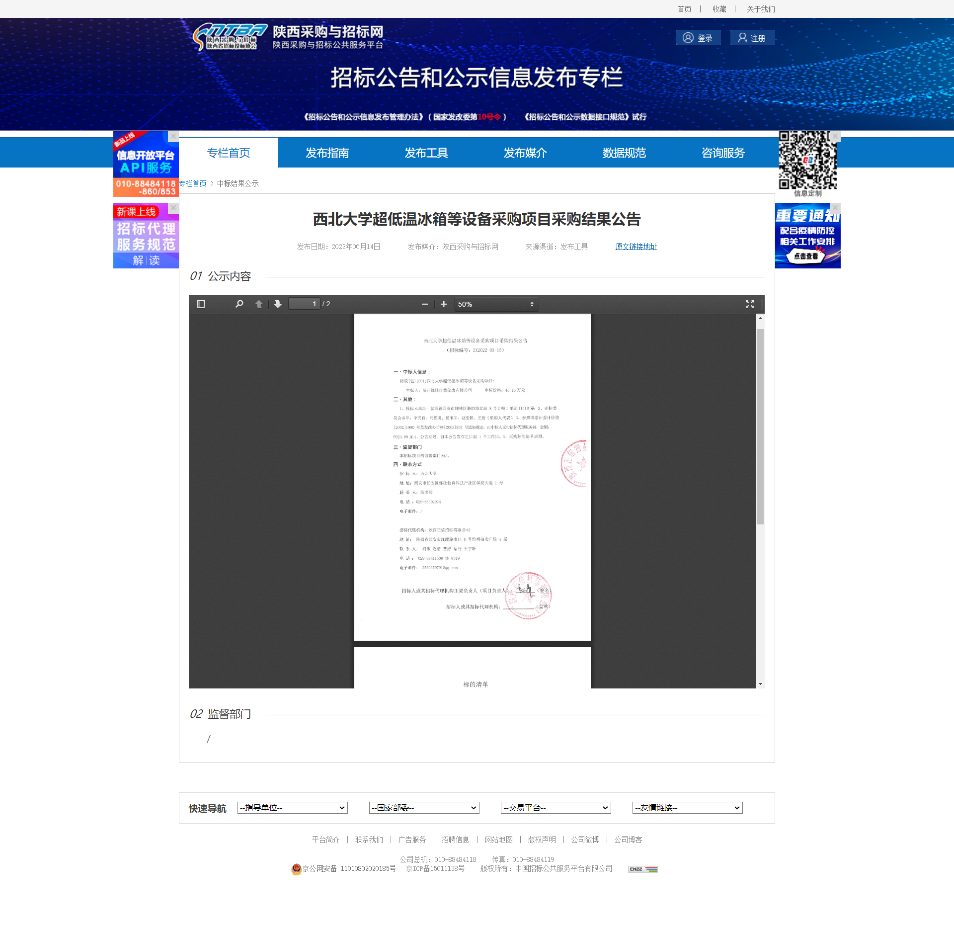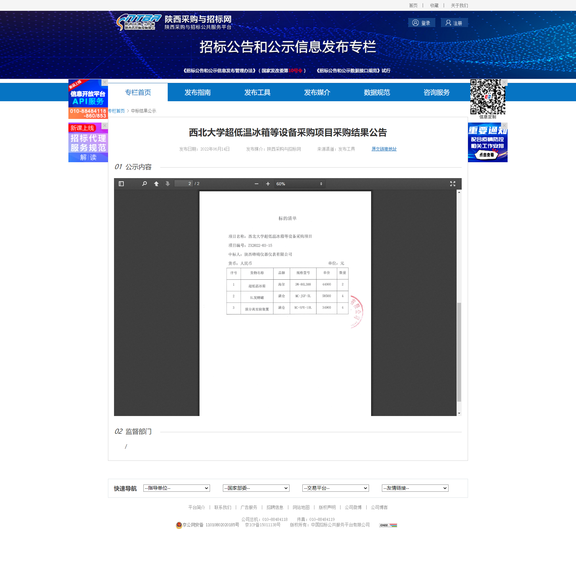 8868体育登录超低温冰箱等设备采购项目采购结果公告 作者: 编辑:薛利娟 时间:2022-06-14 原公告链接:http://bulletin.sntba.com/resultBulletin/2022-06-14/433311.html