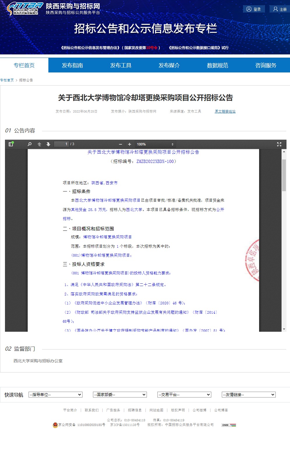 关于8868体育登录博物馆冷却塔更换采购项目公开招标公告 作者: 编辑:采购与招标办公室 时间:2022-06-28 原公告链接:http://bulletin.sntba.com/biddingBulletin/2022-06-28/439809.html