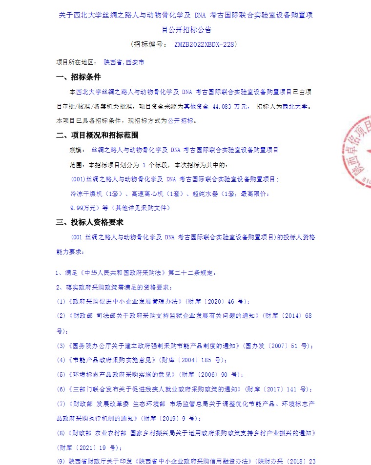 关于8868体育登录丝绸之路人与动物骨化学及DNA考古国际联合实验室设备购置项目公开招标公告
