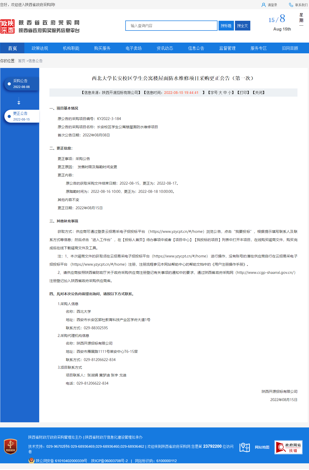 8868体育登录长安校区学生公寓楼屋面防水维修项目采购更正公告(第一次)