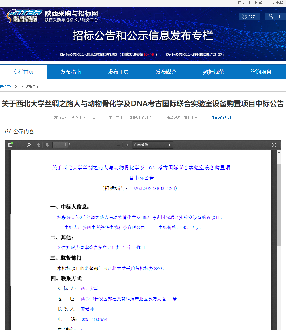 关于8868体育登录丝绸之路人与动物骨化学及DNA考古国际联合实验室设备购置项目中标公告 作者: 编辑:采购与招标办公室 时间:2022-09-06 原公告链接:http://bulletin.sntba.com/resultBulletin/2022-09-06/470905.html