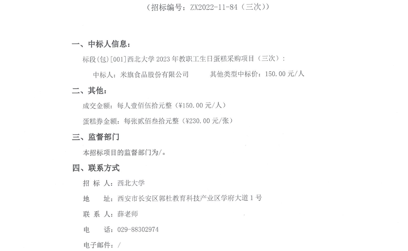 8868体育登录2023年教职工生日蛋糕采购项目(三次)采购结果公告 作者: 编辑:采购与招标办公室 时间:2023-01-11 原公告链接:http://bulletin.sntba.com/resultBulletin/2023-01-11/520362.html