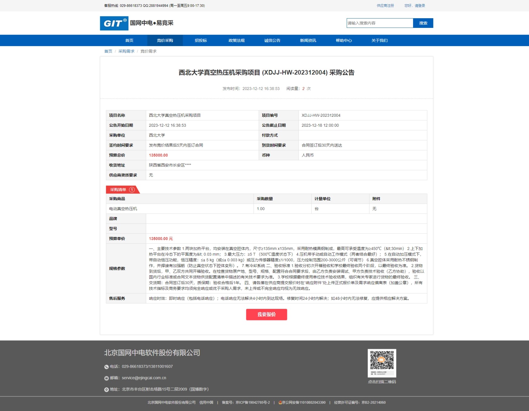 8868体育登录真空热压机采购项目 (XDJJ-HW-202312004) 采购公告 作者: 编辑:采购与招标办公室 时间:2023-12-12 原公告链接:https://www.ejingcai.com.cn/site/bidding/detail/7765