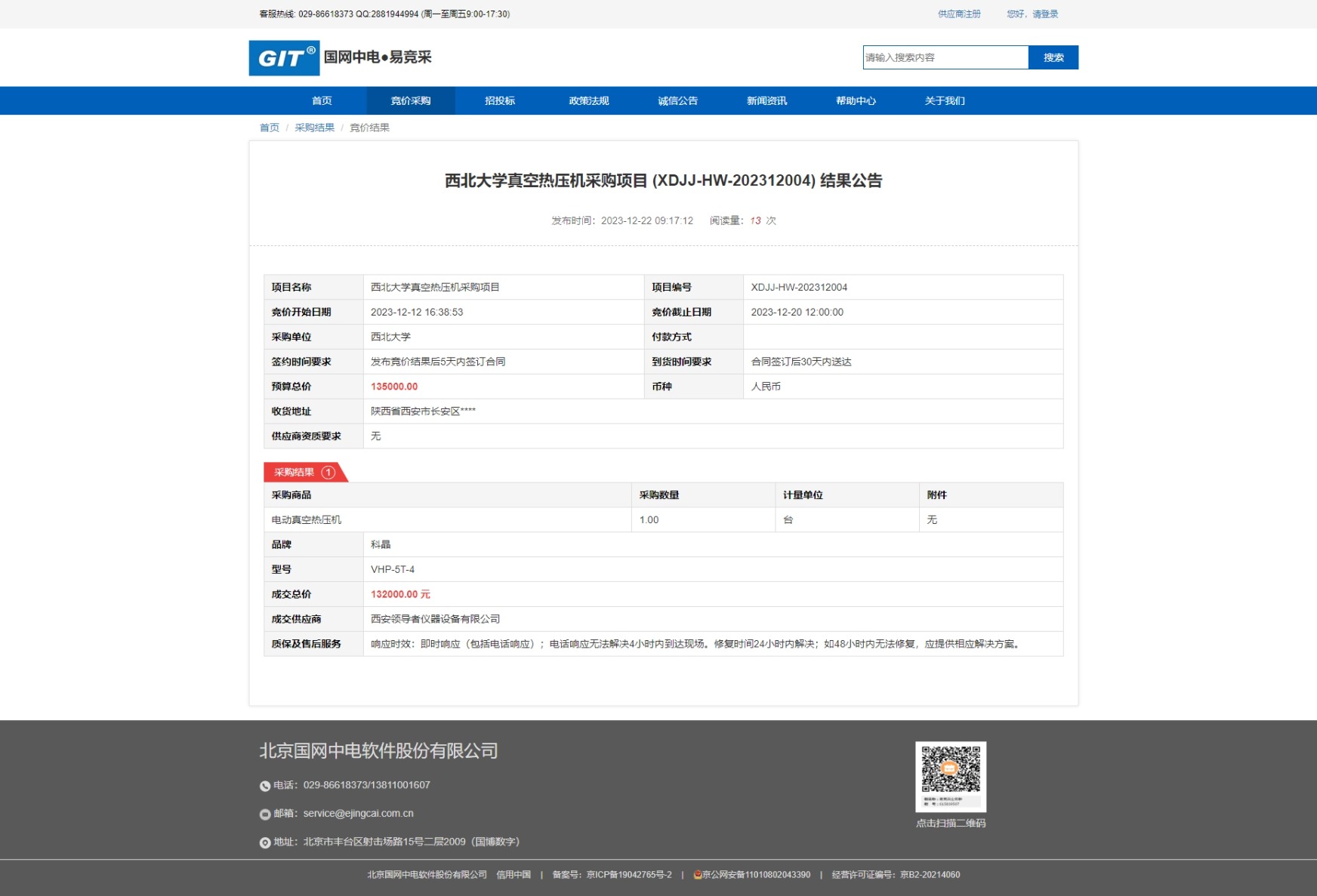 8868体育登录真空热压机采购项目 (XDJJ-HW-202312004) 竞价结果公告 作者: 编辑:采购与招标办公室 时间:2023-12-22 原公告链接:https://www.ejingcai.com.cn/site/bidding/detail/7982