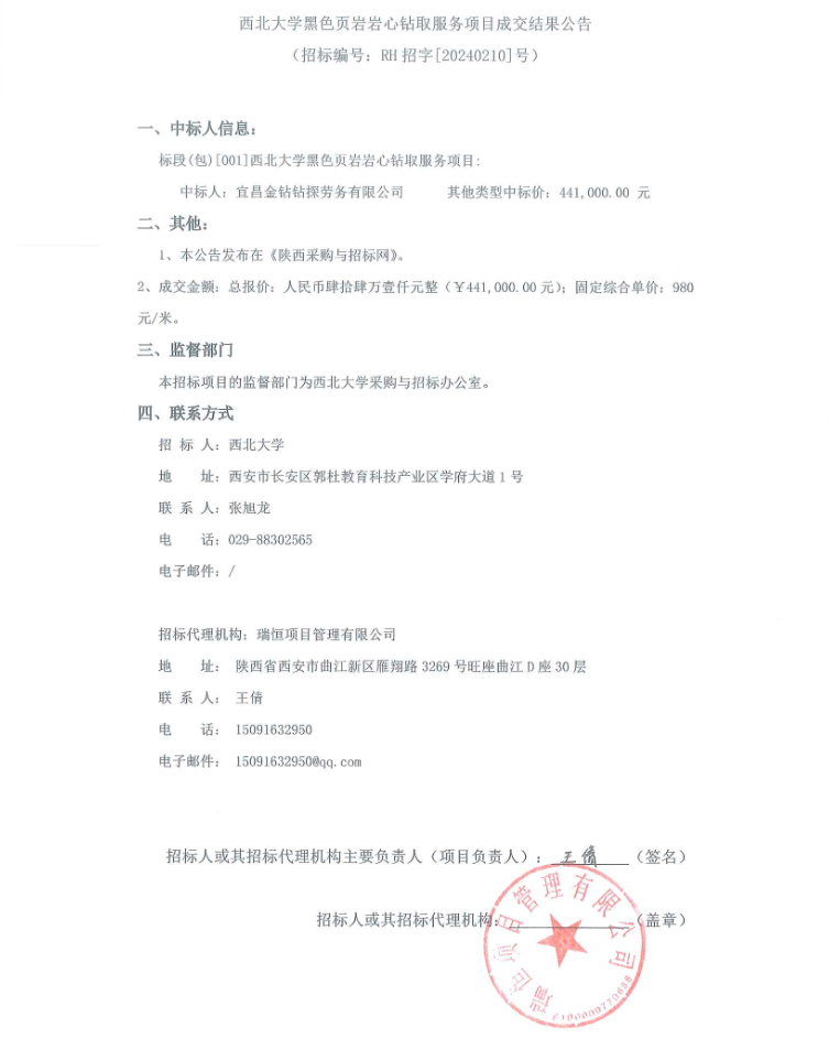 8868体育登录黑色页岩岩心钻取服务项目成交结果公告