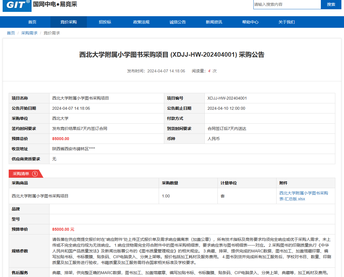 8868体育登录附属小学图书采购项目 (XDJJ-HW-202404001) 竞价公告 作者: 编辑: 时间:2024-04-07 原公告链接:https://www.ejingcai.com.cn/site/bidding/detail/9303