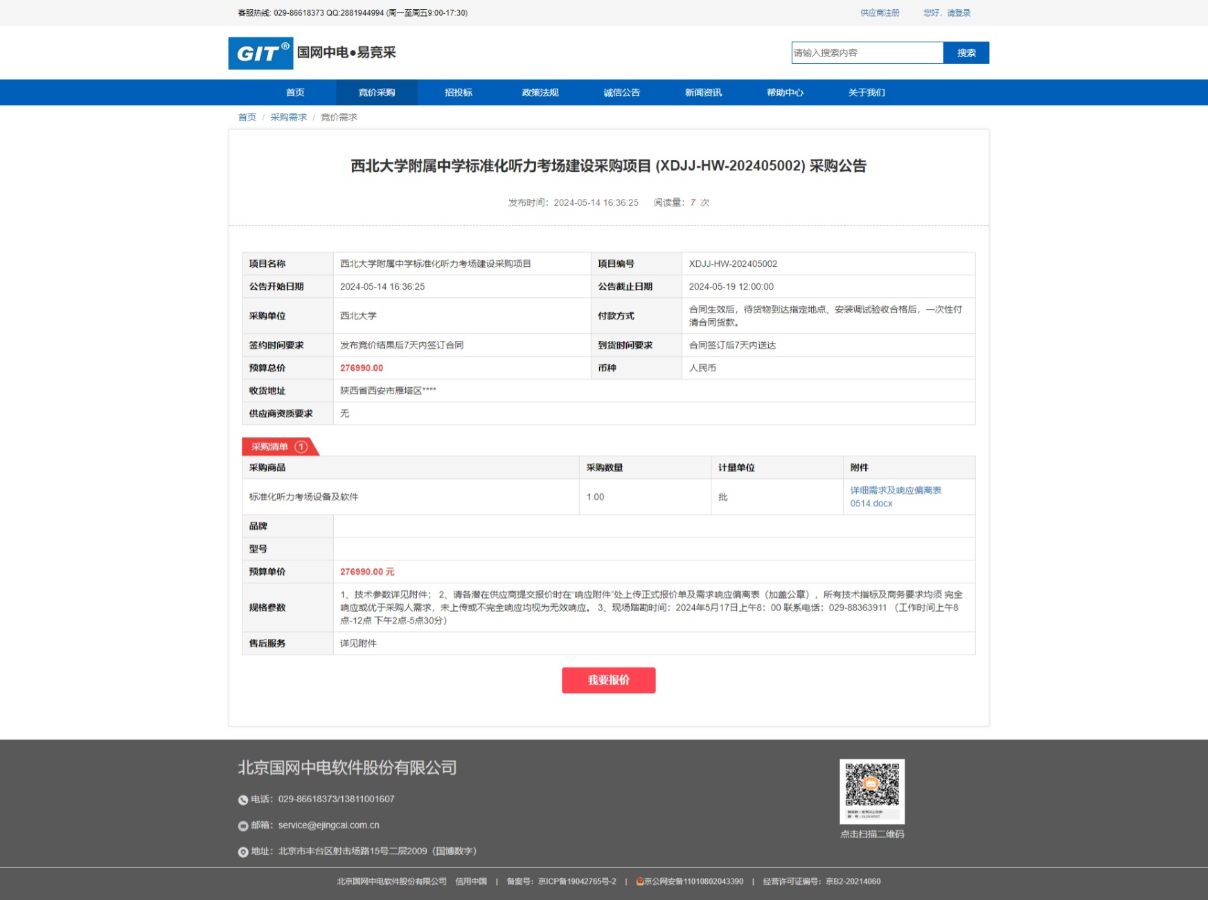 8868体育登录附属中学标准化听力考场建设采购项目 (XDJJ-HW-202405002) 竞价采购公告 作者: 编辑:采购与招标办公室 时间:2024-05-14 原公告链接:https://www.ejingcai.com.cn/site/bidding/detail/10191