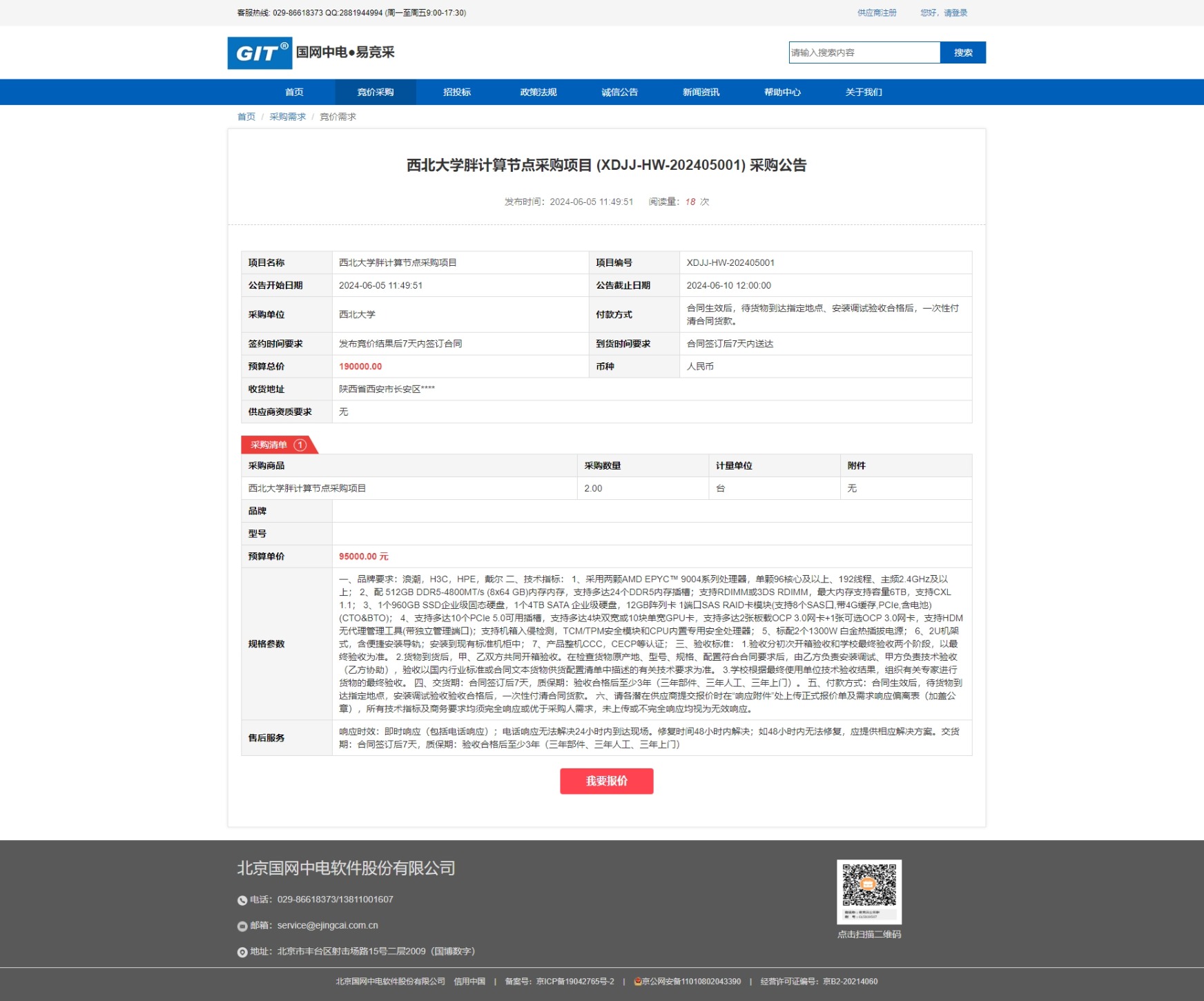 8868体育登录胖计算节点采购项目 (XDJJ-HW-202405001) 采购公告 作者: 编辑:采购与招标办公室 时间:2024-06-05 原公告链接:https://www.ejingcai.com.cn/site/bidding/detail/10763