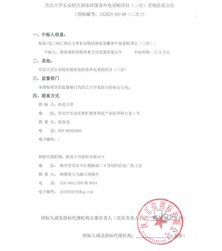 8868体育登录长安校区游泳馆服务外包采购项目(二次)采购结果公告