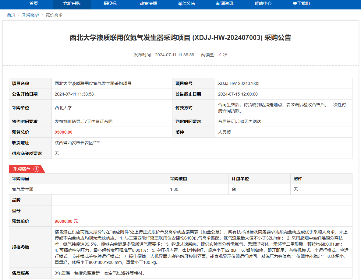 8868体育登录液质联用仪氮气发生器采购项目 (XDJJ-HW-202407003) 竞价采购公告 作者: 编辑: 时间:2024-07-11 原公告链接:https://www.ejingcai.com.cn/site/bidding/detail/11611