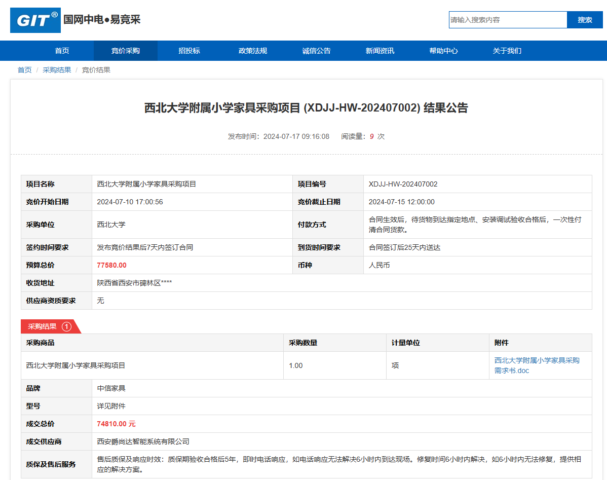 8868体育登录附属小学家具采购项目 (XDJJ-HW-202407002) 竞价结果公告 作者: 编辑: 时间:2024-07-17 原公告链接:https://www.ejingcai.com.cn/site/bidding/detail/11713