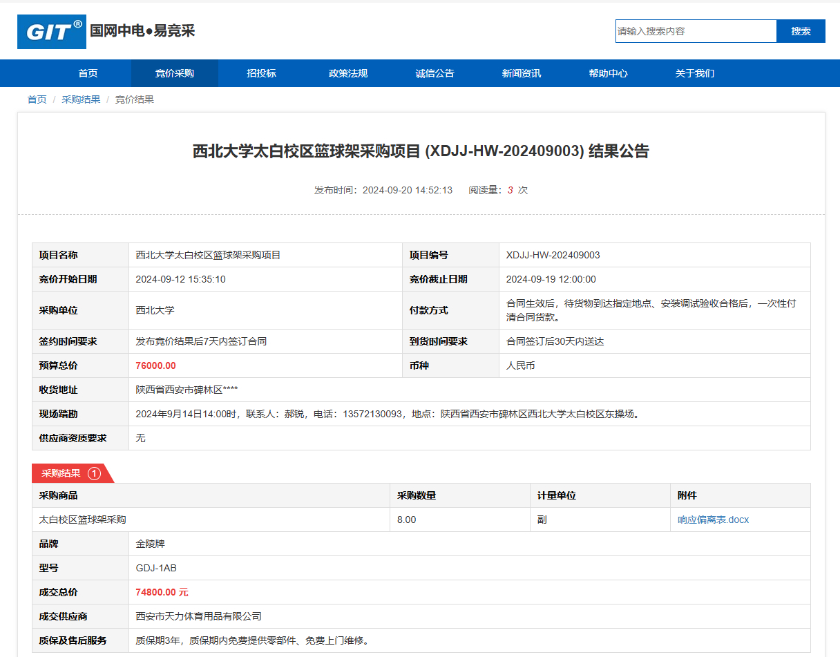 8868体育登录太白校区篮球架采购项目 (XDJJ-HW-202409003)竞价结果公告 作者: 编辑: 时间:2024-09-20 原公告链接:https://www.ejingcai.com.cn/site/bidding/detail/12756