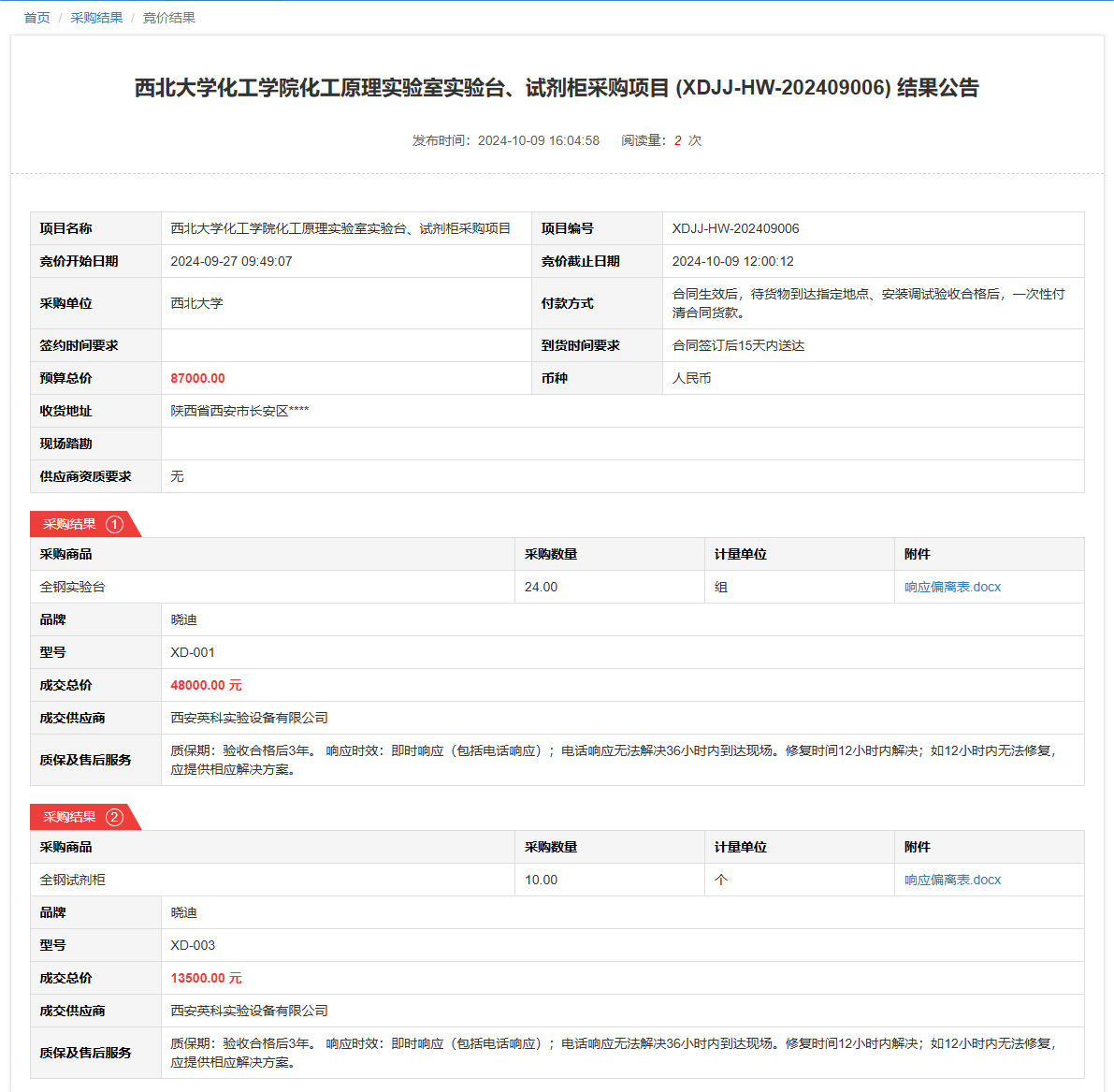 8868体育登录化工学院化工原理实验室实验台、试剂柜采购项目(XDJJ-HW-202409006)竞价结果公告 作者: 编辑: 时间:2024-10-09 原公告链接:https://www.ejingcai.com.cn/site/bidding/detail/13139