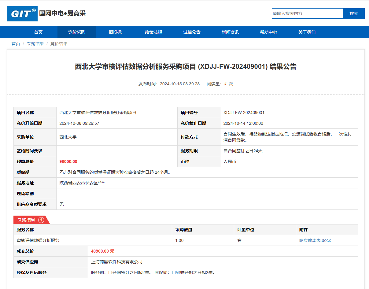 8868体育登录审核评估数据分析服务采购项目(XDJJ-FW-202409001)竞价结果公告 作者:采购与招标办公室 编辑: 时间:2024-10-15 原公告链接:https://www.ejingcai.com.cn/site/bidding/detail/13296