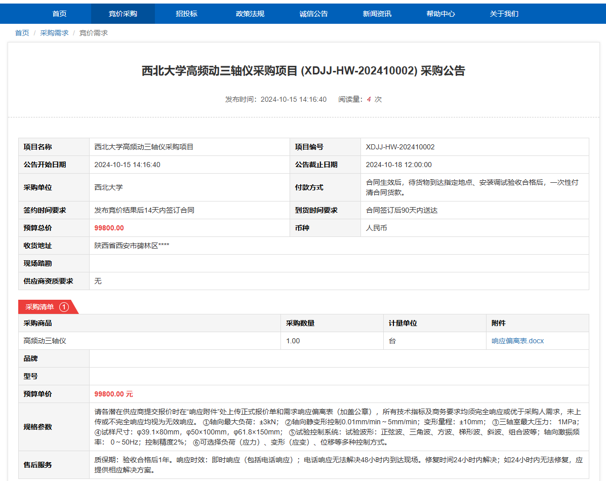 8868体育登录高频动三轴仪采购项目(XDJJ-HW-202410002)竞价采购公告 作者:采购与招标办公室 编辑: 时间:2024-10-15 原公告链接:https://www.ejingcai.com.cn/site/bidding/detail/13317