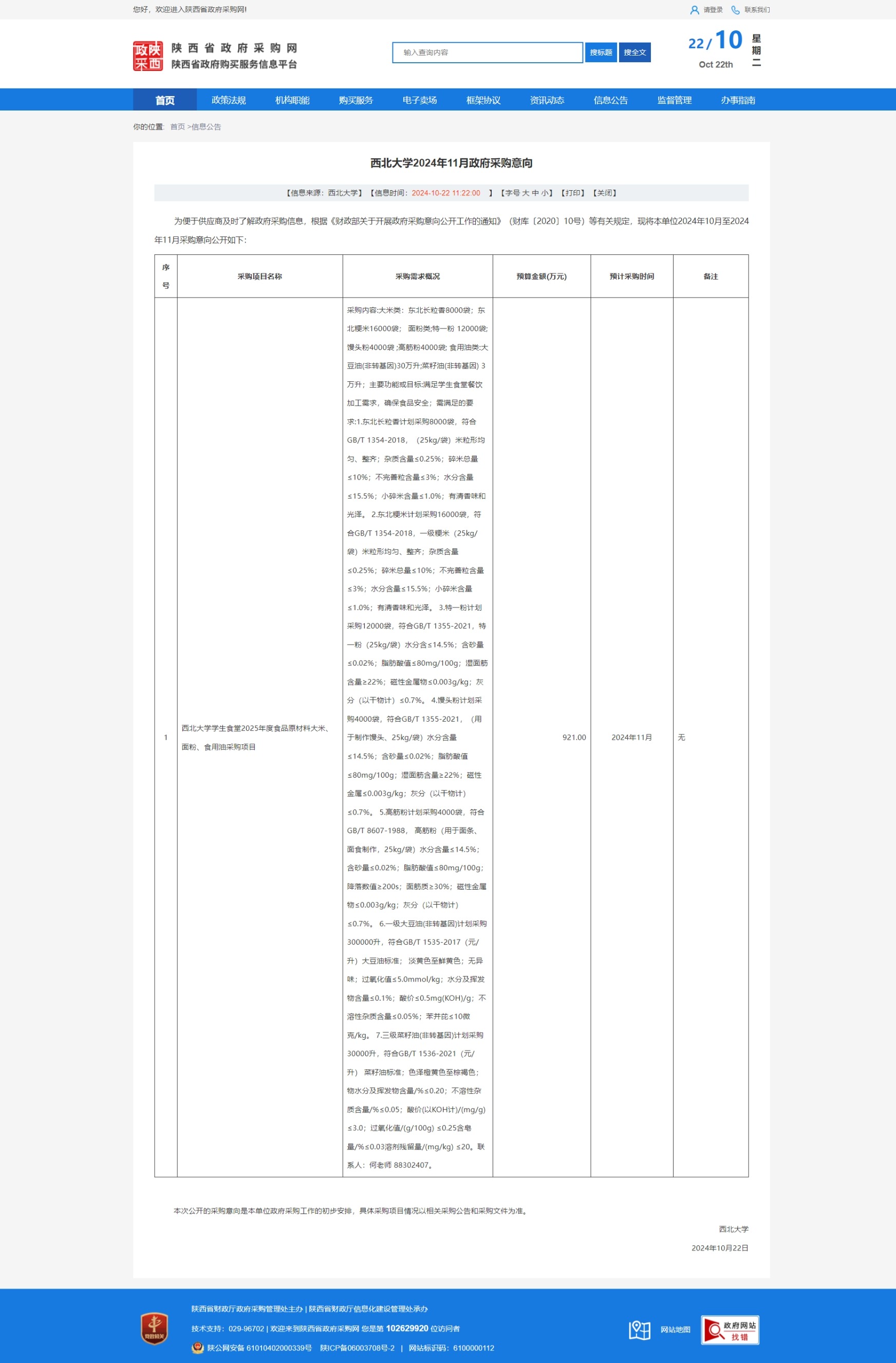 8868体育登录2024年11月政府采购意向(后勤集团食堂米面油项目) 作者: 编辑:采购与招标办公室 时间:2024-10-22 原公告链接:https://www.ccgp-shaanxi.gov.cn/freecms/site/shaanxi/ggxx/info/2024/8a69c95c927dd5a50192b23d9b3031d6.html?noticeType=59¬iceId=5795f07a-9026-11ef-8063-08c0eb20c666