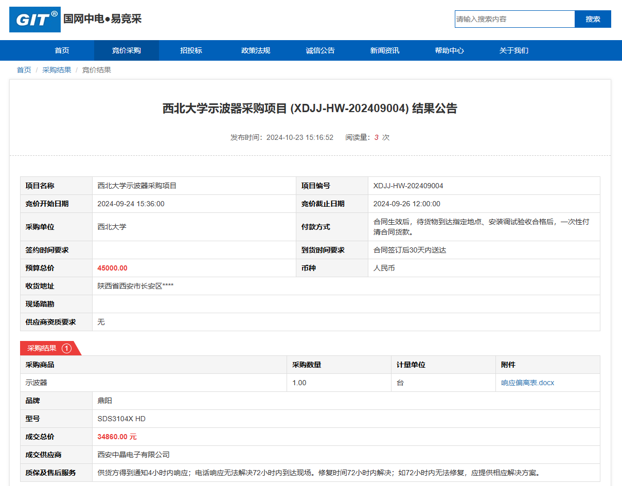 8868体育登录示波器采购项目(XDJJ-HW-202409004)竞价结果公告 作者:采购与招标办公室 编辑: 时间:2024-10-23 原公告链接:https://www.ejingcai.com.cn/site/bidding/detail/13693