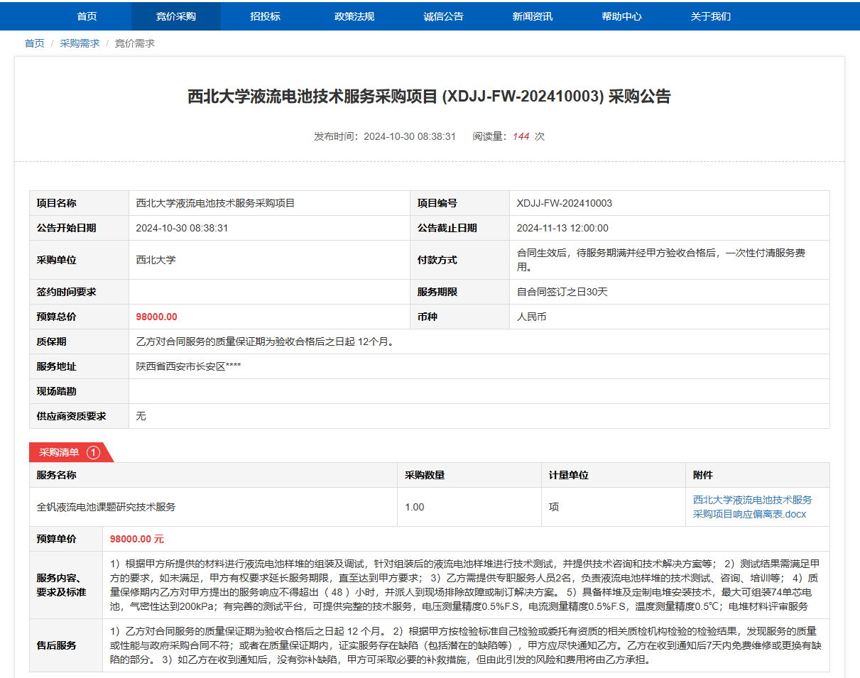 8868体育登录液流电池技术服务采购项目(XDJJ-FW-202410003)竞价采购公告 作者:采购与招标办公室 编辑: 时间:2024-10-30 原公告链接:https://www.ejingcai.com.cn/site/bidding/detail/14096