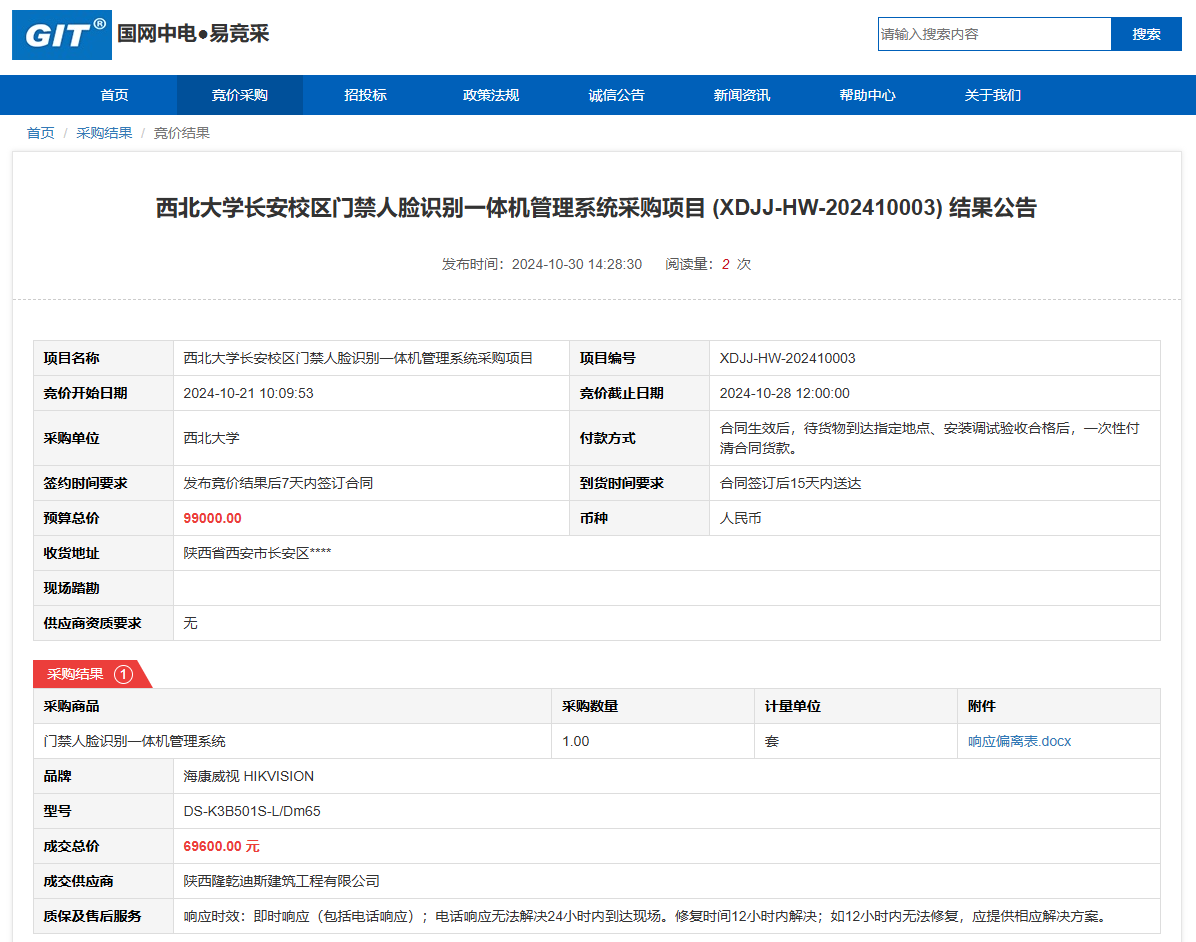 8868体育登录长安校区门禁人脸识别一体机管理系统采购项目(XDJJ-HW-202410003)竞价结果公告 作者:采购与招标办公室 编辑: 时间:2024-10-30 原公告链接:https://www.ejingcai.com.cn/site/bidding/detail/14111