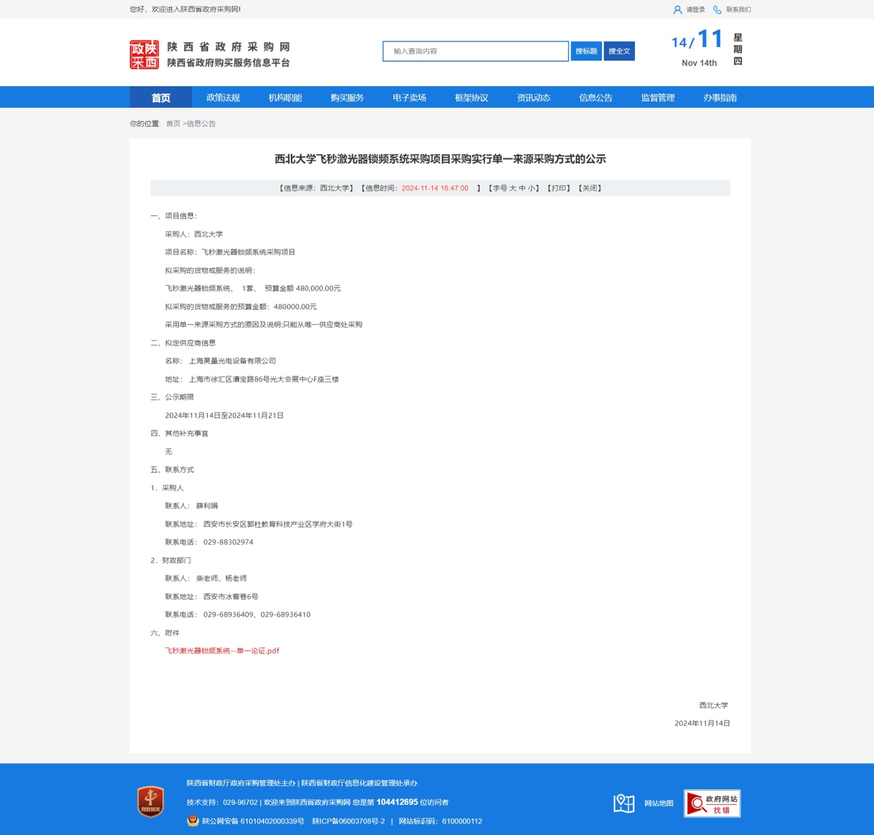8868体育登录飞秒激光器锁频系统采购项目采购实行单一来源采购方式的公示 作者: 编辑:薛利娟 时间:2024-11-14 原公告链接:https://www.ccgp-shaanxi.gov.cn/freecms/site/shaanxi/ggxx/info/2024/8a69c4549327c24f019329d423f649fc.html?noticeType=001051¬iceId=945f4198-a266-11ef-8063-08c0eb20c666