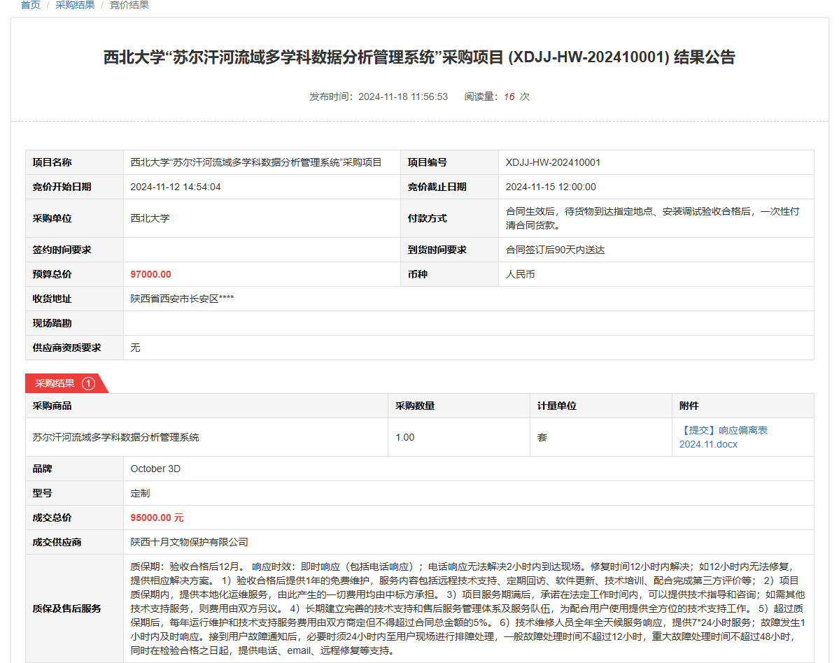 8868体育登录“苏尔汗河流域多学科数据分析管理系统”采购项目(XDJJ-HW-202410001)竞价结果公告 作者:采购与招标办公室 编辑: 时间:2024-11-18 原公告链接:https://www.ejingcai.com.cn/site/bidding/detail/15008