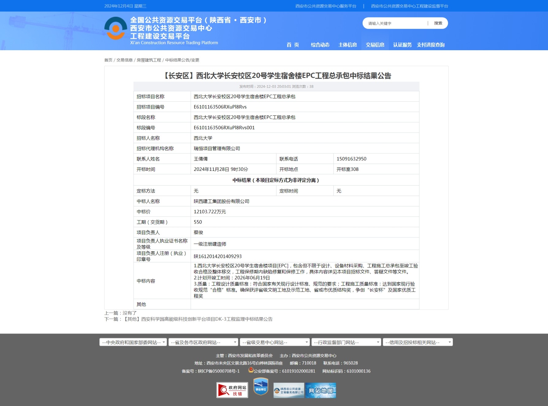 8868体育登录长安校区20号学生宿舍楼EPC工程总承包中标结果公告