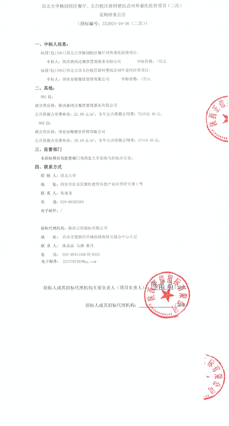 8868体育登录桃园校区餐厅、太白校区新村便民店对外委托经营项目(二次)采购结果公告