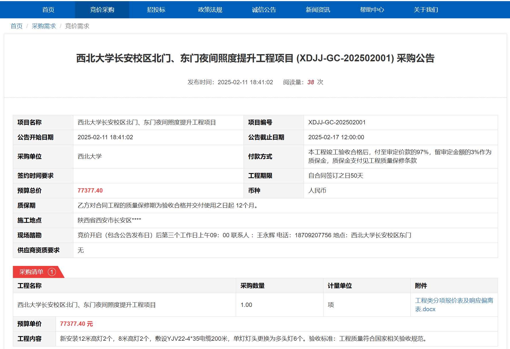 8868体育登录长安校区北门、东门夜间照度提升工程项目(XDJJ-GC-202502001)竞价采购公告 作者:采购与招标办公室 编辑: 时间:2025-02-11 原公告链接:https://www.ejingcai.com.cn/site/bidding/detail/16497