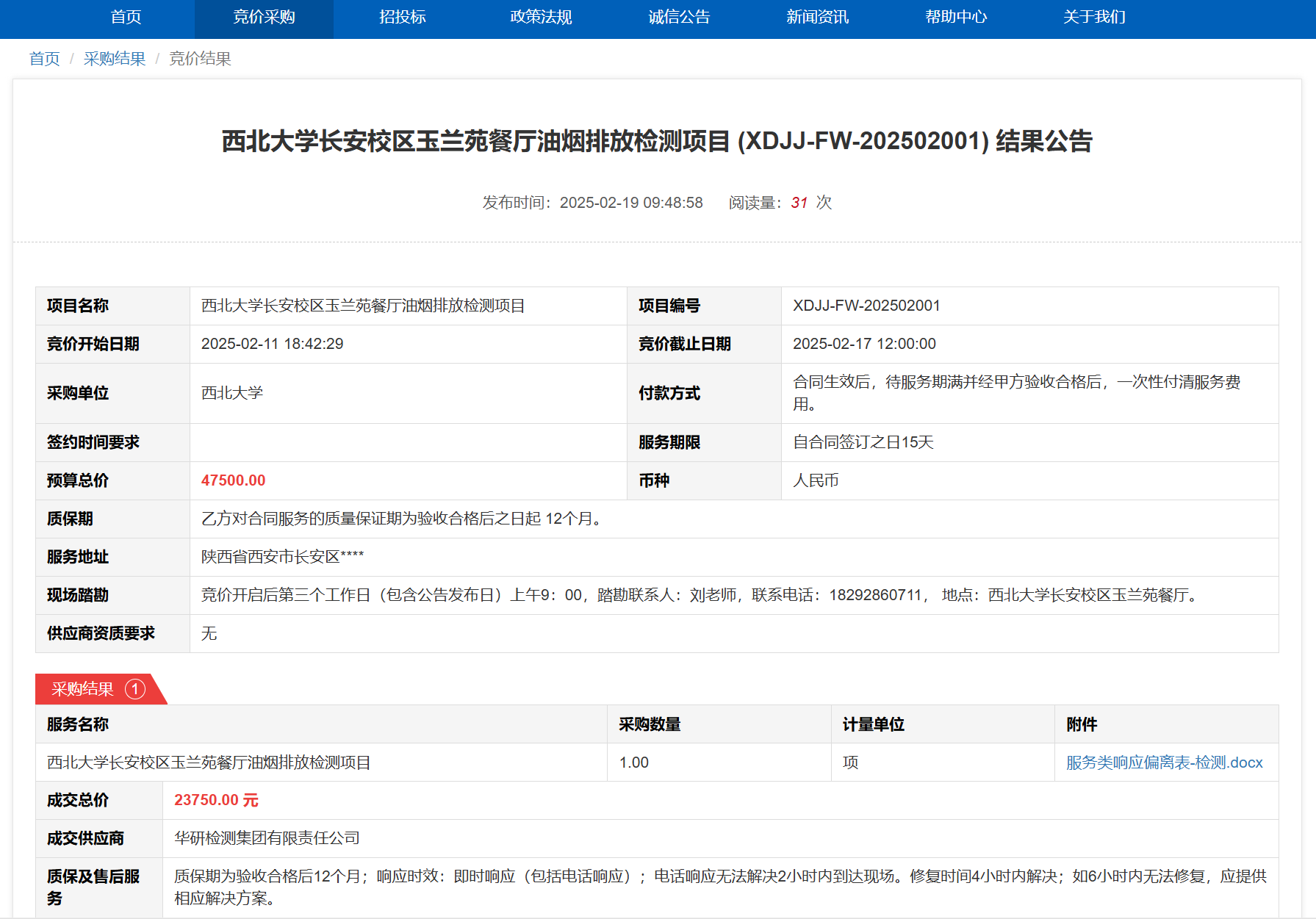8868体育登录长安校区玉兰苑餐厅油烟排放检测项目(XDJJ-FW-202502001)竞价结果公告 作者:采购与招标办公室 编辑: 时间:2025-02-19 原公告链接:https://www.ejingcai.com.cn/site/bidding/detail/16552